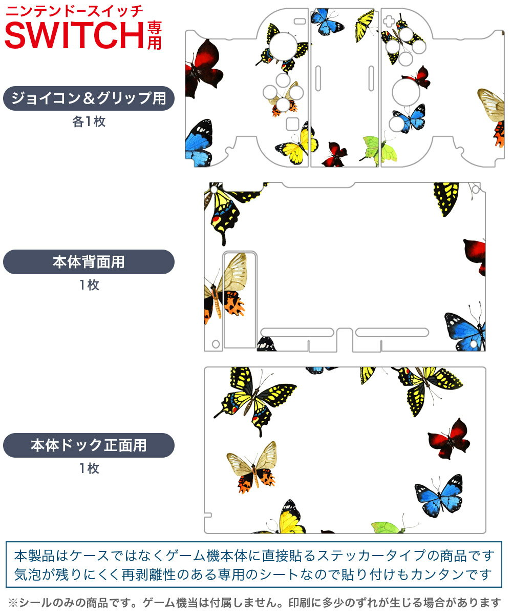 igsticker Nintendo Switch 用 デザインスキンシール 任天堂 ニンテンドー スイッチ 専用 本体ドック Joy-Con Joycon ジョイコン 専用 ゲーム機 カバー アクセサリー フィルム ステッカー 014704 蝶 カラフル