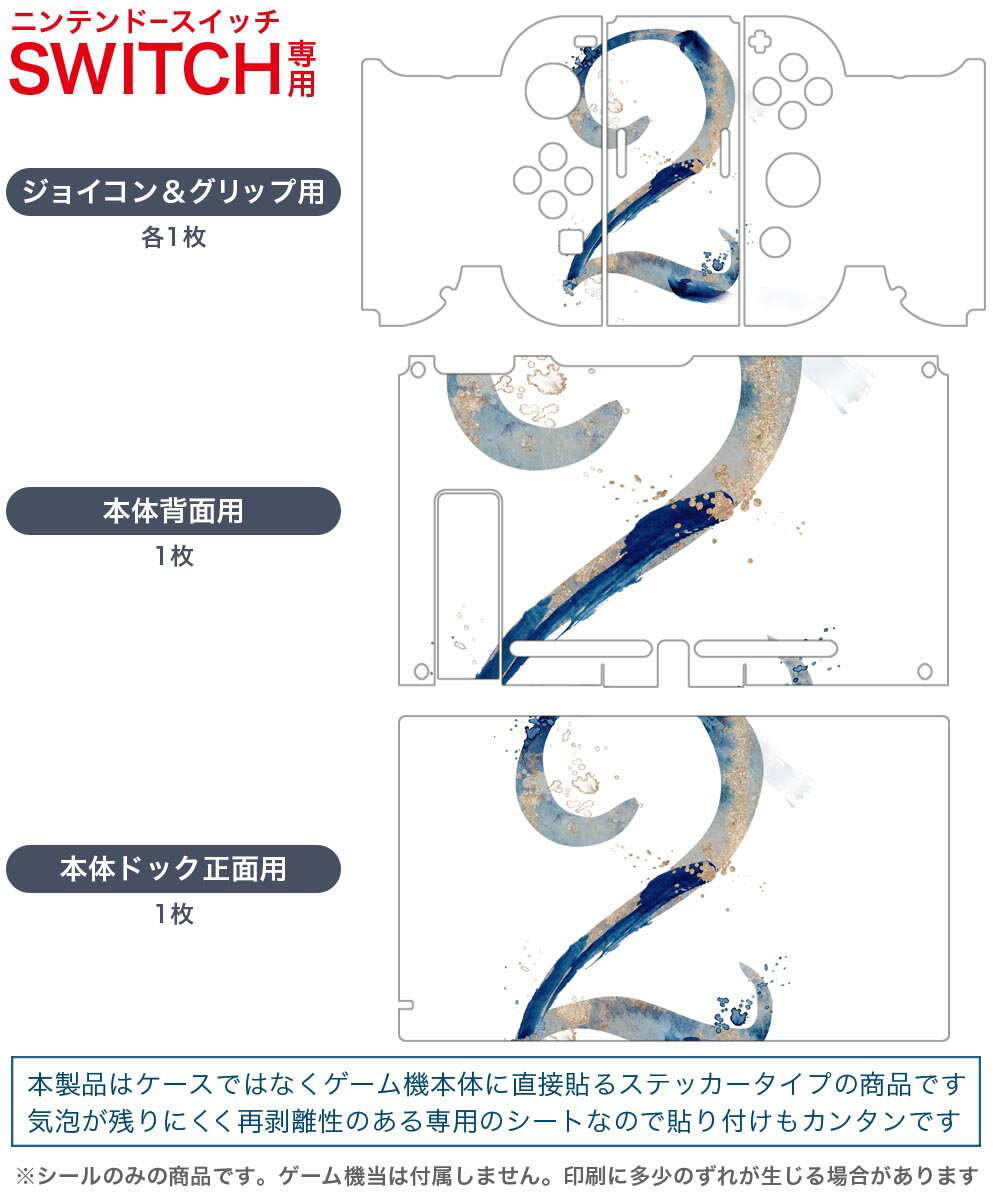 製品名 Nintendo Switch 本体裏面&ドック正面&ジョイコン専用 デザインスキンシール セット内容 Nintendo Switch 本体&ドック&ジョイコン用スキンシール(各1枚) ニンテンドースイッチ専用です。携帯機のSwitch LiteやProコンには対応していません。 商品特徴 再剥離性シートを素材に採用し、細かな位置調整がしやすく貼り直しが容易です。専用の業務プリンターを使い、商品画像と遜色のない美しい印刷仕上がり。 注意事項 画像はサンプルですので、ご覧の環境によっては多少色味に違いを感じる場合がございます。 イメージと違った、モニターと色味が異なるという理由での交換や返金はご対応出来かねます。スキンシールのみの販売で、ニンテンドースイッチ本体などは付属しません。シワができた場合、ドライヤーなどで軽く温め、外側に向けてシワを伸ばすように貼ってください。初回貼付時の位置調整や貼り直しは可能ですが、しっかりと押し付けて接着させた後の再剥離、再利用は保証しておりません。また接着部に油分や汚れが付着しますと角の部分は剥がれやすくなりますので、貼付時はあまり触れないようにご注意ください。無地のセミグロスシートにデザインをプリントした商品で、デコなどの加工はございません。 凹凸や光沢があるように見えたり布地や金属を素材にしたように見える商品もありますが、デザインの図版によるものです。印刷時に微妙な画像のズレが生じる場合がございます。ご注文後に1点1点制作する受注生産品の為、不良品以外のご返品や交換は固くお断りします。当店における繰り返しの実機テストでは問題ありませんでしたが、経過年数や使用環境により、シールを剥がす際に本体の塗装が一部剥がれる可能性があります。恐れ入りますが、万が一そのような状況になった場合でも当店ではゲーム機本体の保証は出来かねますので、予めご理解の上お求めください。 商品発送 完全受注生産のハンドメイド商品となりますので、既製品と比べて発送までお時間を頂いています。 基本的に決済確認後2?3営業日、最大で10営業日での発送となります。繁忙期や休業日明けの場合はさらに時間がかかる場合があります。 その際には別途メールにてご連絡致します。メール便の場合、発送日から到着までに2?4日ほどかかる場合が多く、紛失などの保障もご対応できかねます。あらかじめご了承下さい。