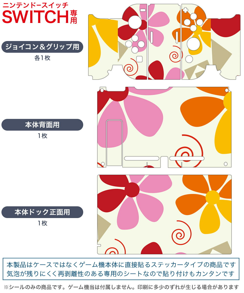 製品名 Nintendo Switch 本体裏面&ドック正面&ジョイコン専用 デザインスキンシール セット内容 Nintendo Switch 本体&ドック&ジョイコン用スキンシール(各1枚) ニンテンドースイッチ専用です。携帯機のSwitch LiteやProコンには対応していません。 商品特徴 再剥離性シートを素材に採用し、細かな位置調整がしやすく貼り直しが容易です。専用の業務プリンターを使い、商品画像と遜色のない美しい印刷仕上がり。 注意事項 画像はサンプルですので、ご覧の環境によっては多少色味に違いを感じる場合がございます。 イメージと違った、モニターと色味が異なるという理由での交換や返金はご対応出来かねます。スキンシールのみの販売で、ニンテンドースイッチ本体などは付属しません。シワができた場合、ドライヤーなどで軽く温め、外側に向けてシワを伸ばすように貼ってください。初回貼付時の位置調整や貼り直しは可能ですが、しっかりと押し付けて接着させた後の再剥離、再利用は保証しておりません。また接着部に油分や汚れが付着しますと角の部分は剥がれやすくなりますので、貼付時はあまり触れないようにご注意ください。無地のセミグロスシートにデザインをプリントした商品で、デコなどの加工はございません。 凹凸や光沢があるように見えたり布地や金属を素材にしたように見える商品もありますが、デザインの図版によるものです。印刷時に微妙な画像のズレが生じる場合がございます。ご注文後に1点1点制作する受注生産品の為、不良品以外のご返品や交換は固くお断りします。当店における繰り返しの実機テストでは問題ありませんでしたが、経過年数や使用環境により、シールを剥がす際に本体の塗装が一部剥がれる可能性があります。恐れ入りますが、万が一そのような状況になった場合でも当店ではゲーム機本体の保証は出来かねますので、予めご理解の上お求めください。 商品発送 完全受注生産のハンドメイド商品となりますので、既製品と比べて発送までお時間を頂いています。 基本的に決済確認後2?3営業日、最大で10営業日での発送となります。繁忙期や休業日明けの場合はさらに時間がかかる場合があります。 その際には別途メールにてご連絡致します。メール便の場合、発送日から到着までに2?4日ほどかかる場合が多く、紛失などの保障もご対応できかねます。あらかじめご了承下さい。
