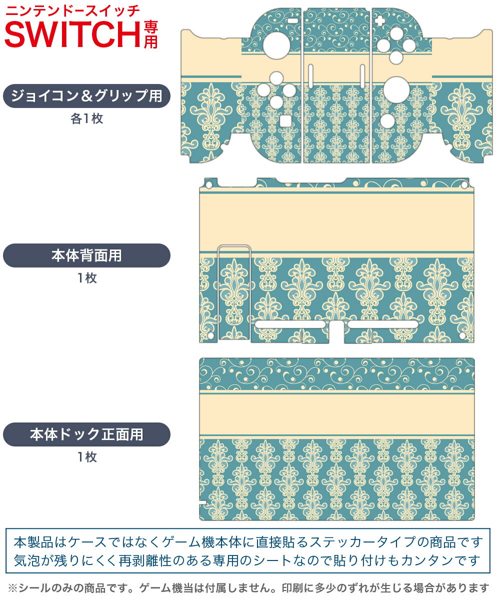 製品名 Nintendo Switch 本体裏面&ドック正面&ジョイコン専用 デザインスキンシール セット内容 Nintendo Switch 本体&ドック&ジョイコン用スキンシール(各1枚) ニンテンドースイッチ専用です。携帯機のSwitch LiteやProコンには対応していません。 商品特徴 再剥離性シートを素材に採用し、細かな位置調整がしやすく貼り直しが容易です。専用の業務プリンターを使い、商品画像と遜色のない美しい印刷仕上がり。 注意事項 画像はサンプルですので、ご覧の環境によっては多少色味に違いを感じる場合がございます。 イメージと違った、モニターと色味が異なるという理由での交換や返金はご対応出来かねます。スキンシールのみの販売で、ニンテンドースイッチ本体などは付属しません。シワができた場合、ドライヤーなどで軽く温め、外側に向けてシワを伸ばすように貼ってください。初回貼付時の位置調整や貼り直しは可能ですが、しっかりと押し付けて接着させた後の再剥離、再利用は保証しておりません。また接着部に油分や汚れが付着しますと角の部分は剥がれやすくなりますので、貼付時はあまり触れないようにご注意ください。無地のセミグロスシートにデザインをプリントした商品で、デコなどの加工はございません。 凹凸や光沢があるように見えたり布地や金属を素材にしたように見える商品もありますが、デザインの図版によるものです。印刷時に微妙な画像のズレが生じる場合がございます。ご注文後に1点1点制作する受注生産品の為、不良品以外のご返品や交換は固くお断りします。当店における繰り返しの実機テストでは問題ありませんでしたが、経過年数や使用環境により、シールを剥がす際に本体の塗装が一部剥がれる可能性があります。恐れ入りますが、万が一そのような状況になった場合でも当店ではゲーム機本体の保証は出来かねますので、予めご理解の上お求めください。 商品発送 完全受注生産のハンドメイド商品となりますので、既製品と比べて発送までお時間を頂いています。 基本的に決済確認後2?3営業日、最大で10営業日での発送となります。繁忙期や休業日明けの場合はさらに時間がかかる場合があります。 その際には別途メールにてご連絡致します。メール便の場合、発送日から到着までに2?4日ほどかかる場合が多く、紛失などの保障もご対応できかねます。あらかじめご了承下さい。