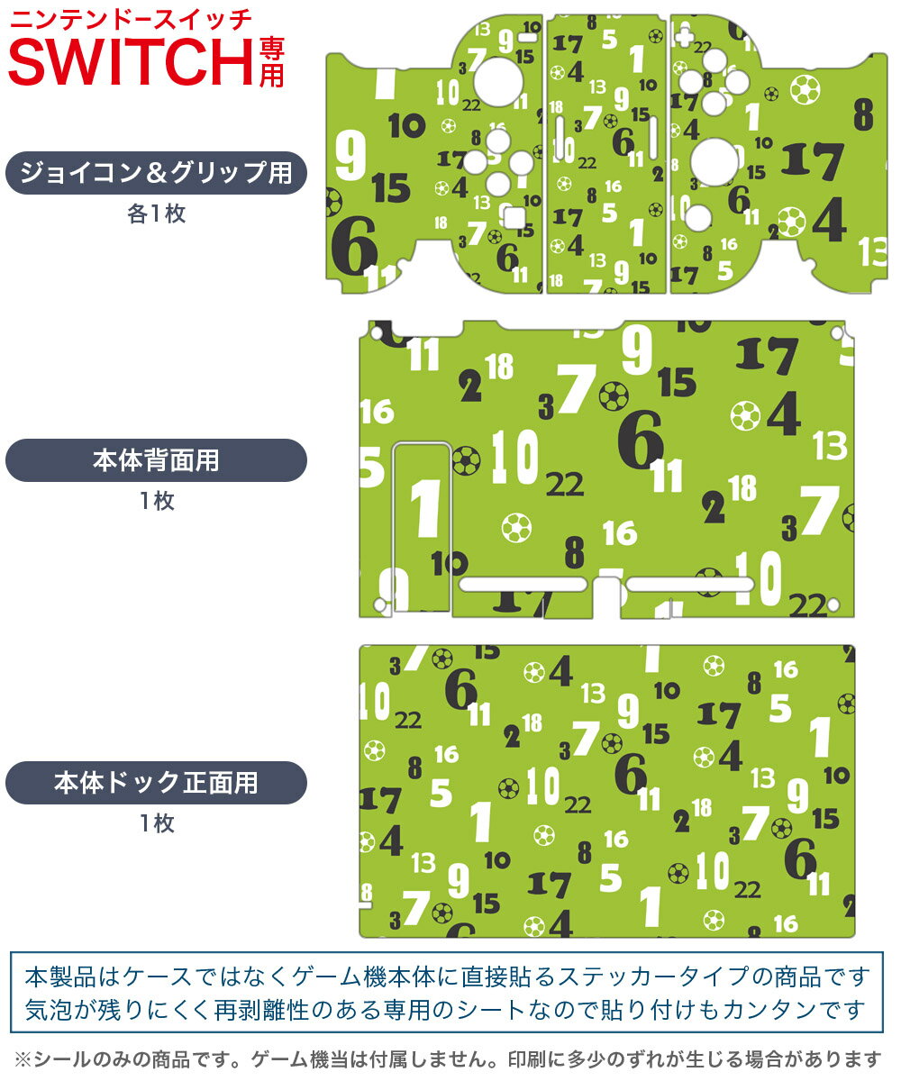 igsticker Nintendo Switch 用 デザインスキンシール 任天堂 ニンテンドー スイッチ 専用 本体ドック Joy-Con Joycon ジョイコン 専用 ゲーム機 カバー アクセサリー フィルム ステッカー 011018 数字 サッカー 緑