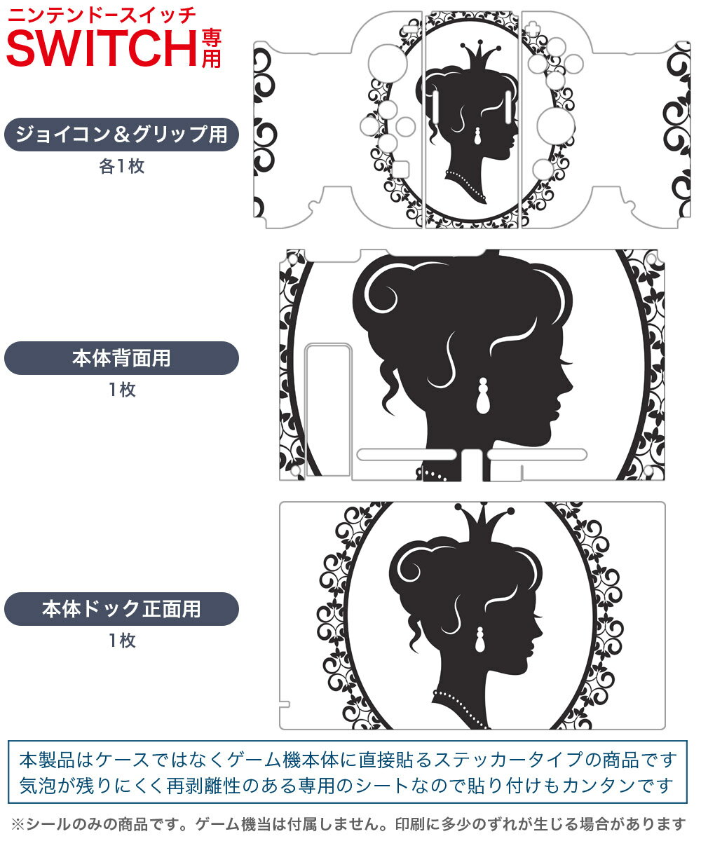 製品名 Nintendo Switch 本体裏面&ドック正面&ジョイコン専用 デザインスキンシール セット内容 Nintendo Switch 本体&ドック&ジョイコン用スキンシール(各1枚) ニンテンドースイッチ専用です。携帯機のSwitch LiteやProコンには対応していません。 商品特徴 再剥離性シートを素材に採用し、細かな位置調整がしやすく貼り直しが容易です。専用の業務プリンターを使い、商品画像と遜色のない美しい印刷仕上がり。 注意事項 画像はサンプルですので、ご覧の環境によっては多少色味に違いを感じる場合がございます。 イメージと違った、モニターと色味が異なるという理由での交換や返金はご対応出来かねます。スキンシールのみの販売で、ニンテンドースイッチ本体などは付属しません。シワができた場合、ドライヤーなどで軽く温め、外側に向けてシワを伸ばすように貼ってください。初回貼付時の位置調整や貼り直しは可能ですが、しっかりと押し付けて接着させた後の再剥離、再利用は保証しておりません。また接着部に油分や汚れが付着しますと角の部分は剥がれやすくなりますので、貼付時はあまり触れないようにご注意ください。無地のセミグロスシートにデザインをプリントした商品で、デコなどの加工はございません。 凹凸や光沢があるように見えたり布地や金属を素材にしたように見える商品もありますが、デザインの図版によるものです。印刷時に微妙な画像のズレが生じる場合がございます。ご注文後に1点1点制作する受注生産品の為、不良品以外のご返品や交換は固くお断りします。当店における繰り返しの実機テストでは問題ありませんでしたが、経過年数や使用環境により、シールを剥がす際に本体の塗装が一部剥がれる可能性があります。恐れ入りますが、万が一そのような状況になった場合でも当店ではゲーム機本体の保証は出来かねますので、予めご理解の上お求めください。 商品発送 完全受注生産のハンドメイド商品となりますので、既製品と比べて発送までお時間を頂いています。 基本的に決済確認後2?3営業日、最大で10営業日での発送となります。繁忙期や休業日明けの場合はさらに時間がかかる場合があります。 その際には別途メールにてご連絡致します。メール便の場合、発送日から到着までに2?4日ほどかかる場合が多く、紛失などの保障もご対応できかねます。あらかじめご了承下さい。