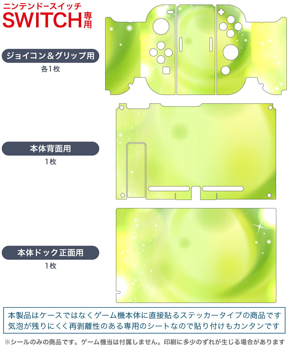 製品名 Nintendo Switch 本体裏面&ドック正面&ジョイコン専用 デザインスキンシール セット内容 Nintendo Switch 本体&ドック&ジョイコン用スキンシール(各1枚) ニンテンドースイッチ専用です。携帯機のSwitch LiteやProコンには対応していません。 商品特徴 再剥離性シートを素材に採用し、細かな位置調整がしやすく貼り直しが容易です。専用の業務プリンターを使い、商品画像と遜色のない美しい印刷仕上がり。 注意事項 画像はサンプルですので、ご覧の環境によっては多少色味に違いを感じる場合がございます。 イメージと違った、モニターと色味が異なるという理由での交換や返金はご対応出来かねます。スキンシールのみの販売で、ニンテンドースイッチ本体などは付属しません。シワができた場合、ドライヤーなどで軽く温め、外側に向けてシワを伸ばすように貼ってください。初回貼付時の位置調整や貼り直しは可能ですが、しっかりと押し付けて接着させた後の再剥離、再利用は保証しておりません。また接着部に油分や汚れが付着しますと角の部分は剥がれやすくなりますので、貼付時はあまり触れないようにご注意ください。無地のセミグロスシートにデザインをプリントした商品で、デコなどの加工はございません。 凹凸や光沢があるように見えたり布地や金属を素材にしたように見える商品もありますが、デザインの図版によるものです。印刷時に微妙な画像のズレが生じる場合がございます。ご注文後に1点1点制作する受注生産品の為、不良品以外のご返品や交換は固くお断りします。当店における繰り返しの実機テストでは問題ありませんでしたが、経過年数や使用環境により、シールを剥がす際に本体の塗装が一部剥がれる可能性があります。恐れ入りますが、万が一そのような状況になった場合でも当店ではゲーム機本体の保証は出来かねますので、予めご理解の上お求めください。 商品発送 完全受注生産のハンドメイド商品となりますので、既製品と比べて発送までお時間を頂いています。 基本的に決済確認後2?3営業日、最大で10営業日での発送となります。繁忙期や休業日明けの場合はさらに時間がかかる場合があります。 その際には別途メールにてご連絡致します。メール便の場合、発送日から到着までに2?4日ほどかかる場合が多く、紛失などの保障もご対応できかねます。あらかじめご了承下さい。