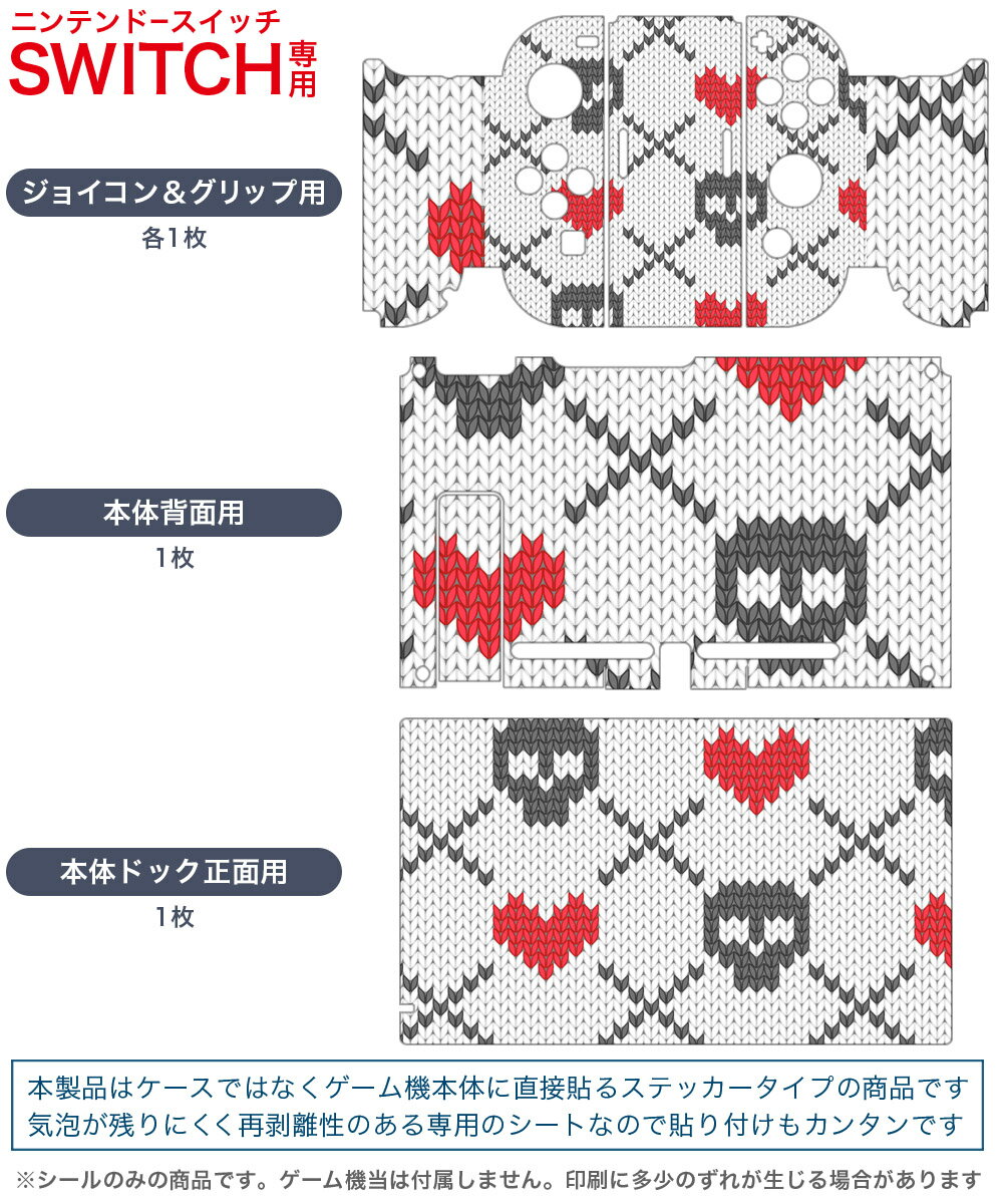 製品名 Nintendo Switch 本体裏面&ドック正面&ジョイコン専用 デザインスキンシール セット内容 Nintendo Switch 本体&ドック&ジョイコン用スキンシール(各1枚) ニンテンドースイッチ専用です。携帯機のSwitch LiteやProコンには対応していません。 商品特徴 再剥離性シートを素材に採用し、細かな位置調整がしやすく貼り直しが容易です。専用の業務プリンターを使い、商品画像と遜色のない美しい印刷仕上がり。 注意事項 画像はサンプルですので、ご覧の環境によっては多少色味に違いを感じる場合がございます。 イメージと違った、モニターと色味が異なるという理由での交換や返金はご対応出来かねます。スキンシールのみの販売で、ニンテンドースイッチ本体などは付属しません。シワができた場合、ドライヤーなどで軽く温め、外側に向けてシワを伸ばすように貼ってください。初回貼付時の位置調整や貼り直しは可能ですが、しっかりと押し付けて接着させた後の再剥離、再利用は保証しておりません。また接着部に油分や汚れが付着しますと角の部分は剥がれやすくなりますので、貼付時はあまり触れないようにご注意ください。無地のセミグロスシートにデザインをプリントした商品で、デコなどの加工はございません。 凹凸や光沢があるように見えたり布地や金属を素材にしたように見える商品もありますが、デザインの図版によるものです。印刷時に微妙な画像のズレが生じる場合がございます。ご注文後に1点1点制作する受注生産品の為、不良品以外のご返品や交換は固くお断りします。当店における繰り返しの実機テストでは問題ありませんでしたが、経過年数や使用環境により、シールを剥がす際に本体の塗装が一部剥がれる可能性があります。恐れ入りますが、万が一そのような状況になった場合でも当店ではゲーム機本体の保証は出来かねますので、予めご理解の上お求めください。 商品発送 完全受注生産のハンドメイド商品となりますので、既製品と比べて発送までお時間を頂いています。 基本的に決済確認後2?3営業日、最大で10営業日での発送となります。繁忙期や休業日明けの場合はさらに時間がかかる場合があります。 その際には別途メールにてご連絡致します。メール便の場合、発送日から到着までに2?4日ほどかかる場合が多く、紛失などの保障もご対応できかねます。あらかじめご了承下さい。