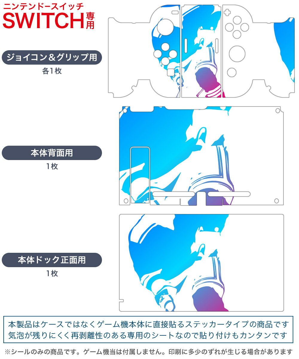 製品名 Nintendo Switch 本体裏面&ドック正面&ジョイコン専用 デザインスキンシール セット内容 Nintendo Switch 本体&ドック&ジョイコン用スキンシール(各1枚) ニンテンドースイッチ専用です。携帯機のSwitch LiteやProコンには対応していません。 商品特徴 再剥離性シートを素材に採用し、細かな位置調整がしやすく貼り直しが容易です。専用の業務プリンターを使い、商品画像と遜色のない美しい印刷仕上がり。 注意事項 画像はサンプルですので、ご覧の環境によっては多少色味に違いを感じる場合がございます。 イメージと違った、モニターと色味が異なるという理由での交換や返金はご対応出来かねます。スキンシールのみの販売で、ニンテンドースイッチ本体などは付属しません。シワができた場合、ドライヤーなどで軽く温め、外側に向けてシワを伸ばすように貼ってください。初回貼付時の位置調整や貼り直しは可能ですが、しっかりと押し付けて接着させた後の再剥離、再利用は保証しておりません。また接着部に油分や汚れが付着しますと角の部分は剥がれやすくなりますので、貼付時はあまり触れないようにご注意ください。無地のセミグロスシートにデザインをプリントした商品で、デコなどの加工はございません。 凹凸や光沢があるように見えたり布地や金属を素材にしたように見える商品もありますが、デザインの図版によるものです。印刷時に微妙な画像のズレが生じる場合がございます。ご注文後に1点1点制作する受注生産品の為、不良品以外のご返品や交換は固くお断りします。当店における繰り返しの実機テストでは問題ありませんでしたが、経過年数や使用環境により、シールを剥がす際に本体の塗装が一部剥がれる可能性があります。恐れ入りますが、万が一そのような状況になった場合でも当店ではゲーム機本体の保証は出来かねますので、予めご理解の上お求めください。 商品発送 完全受注生産のハンドメイド商品となりますので、既製品と比べて発送までお時間を頂いています。 基本的に決済確認後2?3営業日、最大で10営業日での発送となります。繁忙期や休業日明けの場合はさらに時間がかかる場合があります。 その際には別途メールにてご連絡致します。メール便の場合、発送日から到着までに2?4日ほどかかる場合が多く、紛失などの保障もご対応できかねます。あらかじめご了承下さい。