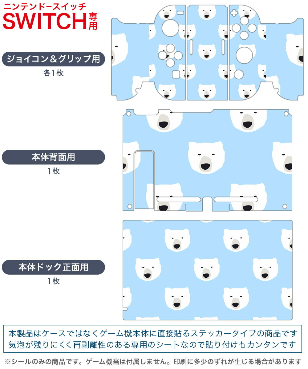 製品名 Nintendo Switch 本体裏面&ドック正面&ジョイコン専用 デザインスキンシール セット内容 Nintendo Switch 本体&ドック&ジョイコン用スキンシール(各1枚) ニンテンドースイッチ専用です。携帯機のSwitch LiteやProコンには対応していません。 商品特徴 再剥離性シートを素材に採用し、細かな位置調整がしやすく貼り直しが容易です。専用の業務プリンターを使い、商品画像と遜色のない美しい印刷仕上がり。 注意事項 画像はサンプルですので、ご覧の環境によっては多少色味に違いを感じる場合がございます。 イメージと違った、モニターと色味が異なるという理由での交換や返金はご対応出来かねます。スキンシールのみの販売で、ニンテンドースイッチ本体などは付属しません。シワができた場合、ドライヤーなどで軽く温め、外側に向けてシワを伸ばすように貼ってください。初回貼付時の位置調整や貼り直しは可能ですが、しっかりと押し付けて接着させた後の再剥離、再利用は保証しておりません。また接着部に油分や汚れが付着しますと角の部分は剥がれやすくなりますので、貼付時はあまり触れないようにご注意ください。無地のセミグロスシートにデザインをプリントした商品で、デコなどの加工はございません。 凹凸や光沢があるように見えたり布地や金属を素材にしたように見える商品もありますが、デザインの図版によるものです。印刷時に微妙な画像のズレが生じる場合がございます。ご注文後に1点1点制作する受注生産品の為、不良品以外のご返品や交換は固くお断りします。当店における繰り返しの実機テストでは問題ありませんでしたが、経過年数や使用環境により、シールを剥がす際に本体の塗装が一部剥がれる可能性があります。恐れ入りますが、万が一そのような状況になった場合でも当店ではゲーム機本体の保証は出来かねますので、予めご理解の上お求めください。 商品発送 完全受注生産のハンドメイド商品となりますので、既製品と比べて発送までお時間を頂いています。 基本的に決済確認後2?3営業日、最大で10営業日での発送となります。繁忙期や休業日明けの場合はさらに時間がかかる場合があります。 その際には別途メールにてご連絡致します。メール便の場合、発送日から到着までに2?4日ほどかかる場合が多く、紛失などの保障もご対応できかねます。あらかじめご了承下さい。