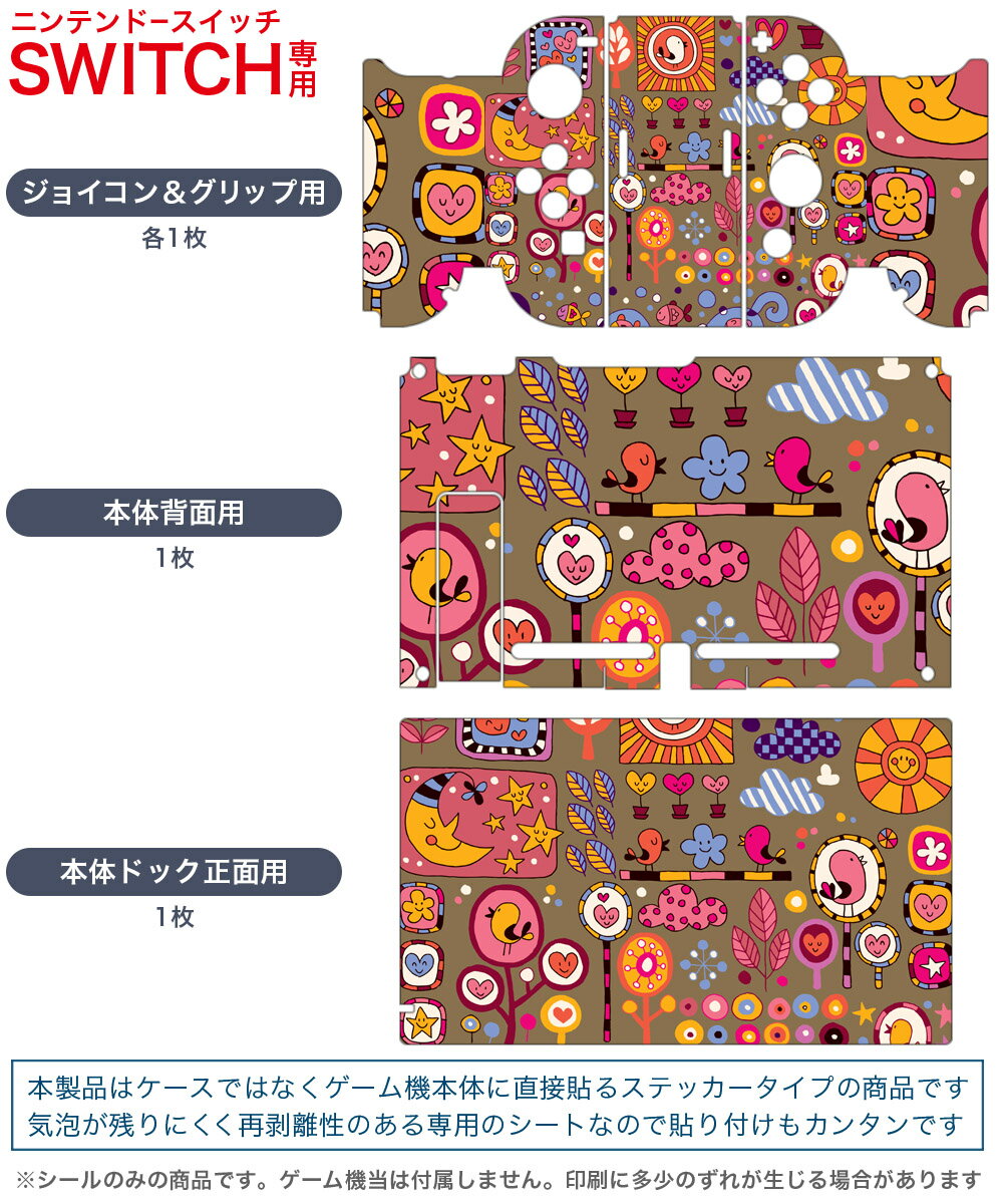 製品名 Nintendo Switch 本体裏面&ドック正面&ジョイコン専用 デザインスキンシール セット内容 Nintendo Switch 本体&ドック&ジョイコン用スキンシール(各1枚) ニンテンドースイッチ専用です。携帯機のSwitch LiteやProコンには対応していません。 商品特徴 再剥離性シートを素材に採用し、細かな位置調整がしやすく貼り直しが容易です。専用の業務プリンターを使い、商品画像と遜色のない美しい印刷仕上がり。 注意事項 画像はサンプルですので、ご覧の環境によっては多少色味に違いを感じる場合がございます。 イメージと違った、モニターと色味が異なるという理由での交換や返金はご対応出来かねます。スキンシールのみの販売で、ニンテンドースイッチ本体などは付属しません。シワができた場合、ドライヤーなどで軽く温め、外側に向けてシワを伸ばすように貼ってください。初回貼付時の位置調整や貼り直しは可能ですが、しっかりと押し付けて接着させた後の再剥離、再利用は保証しておりません。また接着部に油分や汚れが付着しますと角の部分は剥がれやすくなりますので、貼付時はあまり触れないようにご注意ください。無地のセミグロスシートにデザインをプリントした商品で、デコなどの加工はございません。 凹凸や光沢があるように見えたり布地や金属を素材にしたように見える商品もありますが、デザインの図版によるものです。印刷時に微妙な画像のズレが生じる場合がございます。ご注文後に1点1点制作する受注生産品の為、不良品以外のご返品や交換は固くお断りします。当店における繰り返しの実機テストでは問題ありませんでしたが、経過年数や使用環境により、シールを剥がす際に本体の塗装が一部剥がれる可能性があります。恐れ入りますが、万が一そのような状況になった場合でも当店ではゲーム機本体の保証は出来かねますので、予めご理解の上お求めください。 商品発送 完全受注生産のハンドメイド商品となりますので、既製品と比べて発送までお時間を頂いています。 基本的に決済確認後2?3営業日、最大で10営業日での発送となります。繁忙期や休業日明けの場合はさらに時間がかかる場合があります。 その際には別途メールにてご連絡致します。メール便の場合、発送日から到着までに2?4日ほどかかる場合が多く、紛失などの保障もご対応できかねます。あらかじめご了承下さい。