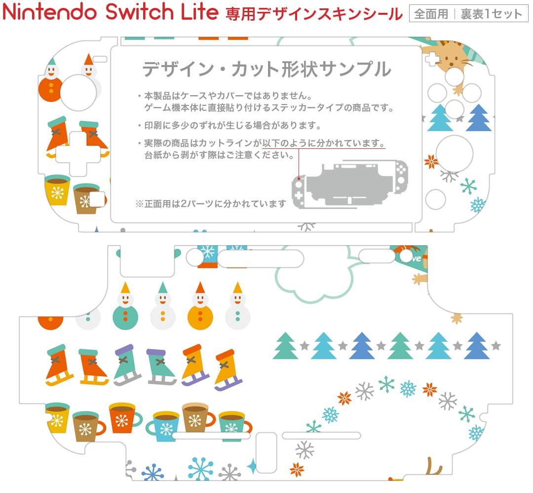 製品名 Nintendo Switch Lite専用 デザインスキンシール セット内容 Nintendo Switch Lite本体用スキンシール(裏表)各1枚 ※液晶側シールは2パーツに分かれていますニンテンドースイッチライト専用です。据え置き機のSwitch本体やJoyコンには対応していません。 商品特徴 3M社製の再剥離性シートを素材に採用し、細かな位置調整がしやすく貼り直しが容易です。また、エアフリーでもありますので気泡が簡単に逃げるので、キレイに貼ることができます。専用の業務プリンターを使い、商品画像と遜色のない美しい印刷仕上がり。 注意事項 画像はサンプルですので、ご覧の環境によっては多少色味に違いを感じる場合がございます。 イメージと違った、モニターと色味が異なるという理由での交換や返金はご対応出来かねます。スキンシールのみの販売で、ニンテンドースイッチ本体などは付属しません。シワができた場合、ドライヤーなどで軽く温め、外側に向けてシワを伸ばすように貼ってください。初回貼付時の位置調整や貼り直しは可能ですが、しっかりと押し付けて接着させた後の再剥離、再利用は保証しておりません。また接着部に油分や汚れが付着しますと角の部分は剥がれやすくなりますので、貼付時はあまり触れないようにご注意ください。無地のセミグロスシートにデザインをプリントした商品で、デコなどの加工はございません。 凹凸や光沢があるように見えたり布地や金属を素材にしたように見える商品もありますが、デザインの図版によるものです。印刷時に微妙な画像のズレが生じる場合がございます。ご注文後に1点1点制作する受注生産品の為、不良品以外のご返品や交換は固くお断りします。 商品発送 完全受注生産のハンドメイド商品となりますので、既製品と比べて発送までお時間を頂いています。 基本的に決済確認後2?3営業日、最大で10営業日での発送となります。繁忙期や休業日明けの場合はさらに時間がかかる場合があります。 その際には別途メールにてご連絡致します。メール便の場合、発送日から到着までに2?4日ほどかかる場合が多く、紛失などの保障もご対応できかねます。あらかじめご了承下さい。