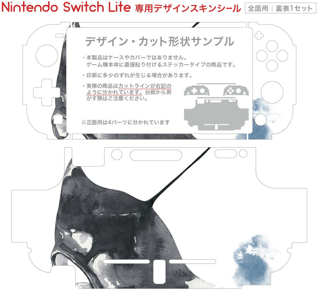 製品名 Nintendo Switch Lite専用 デザインスキンシール セット内容 Nintendo Switch Lite本体用スキンシール(裏表)各1枚 ※液晶側シールは2パーツに分かれていますニンテンドースイッチライト専用です。据え置き機のSwitch本体やJoyコンには対応していません。 商品特徴 3M社製の再剥離性シートを素材に採用し、細かな位置調整がしやすく貼り直しが容易です。また、エアフリーでもありますので気泡が簡単に逃げるので、キレイに貼ることができます。専用の業務プリンターを使い、商品画像と遜色のない美しい印刷仕上がり。 注意事項 画像はサンプルですので、ご覧の環境によっては多少色味に違いを感じる場合がございます。 イメージと違った、モニターと色味が異なるという理由での交換や返金はご対応出来かねます。スキンシールのみの販売で、ニンテンドースイッチ本体などは付属しません。シワができた場合、ドライヤーなどで軽く温め、外側に向けてシワを伸ばすように貼ってください。初回貼付時の位置調整や貼り直しは可能ですが、しっかりと押し付けて接着させた後の再剥離、再利用は保証しておりません。また接着部に油分や汚れが付着しますと角の部分は剥がれやすくなりますので、貼付時はあまり触れないようにご注意ください。無地のセミグロスシートにデザインをプリントした商品で、デコなどの加工はございません。 凹凸や光沢があるように見えたり布地や金属を素材にしたように見える商品もありますが、デザインの図版によるものです。印刷時に微妙な画像のズレが生じる場合がございます。ご注文後に1点1点制作する受注生産品の為、不良品以外のご返品や交換は固くお断りします。 商品発送 完全受注生産のハンドメイド商品となりますので、既製品と比べて発送までお時間を頂いています。 基本的に決済確認後2?3営業日、最大で10営業日での発送となります。繁忙期や休業日明けの場合はさらに時間がかかる場合があります。 その際には別途メールにてご連絡致します。メール便の場合、発送日から到着までに2?4日ほどかかる場合が多く、紛失などの保障もご対応できかねます。あらかじめご了承下さい。