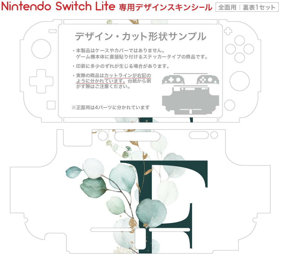 製品名 Nintendo Switch Lite専用 デザインスキンシール セット内容 Nintendo Switch Lite本体用スキンシール(裏表)各1枚 ※液晶側シールは2パーツに分かれていますニンテンドースイッチライト専用です。据え置き機のSwitch本体やJoyコンには対応していません。 商品特徴 3M社製の再剥離性シートを素材に採用し、細かな位置調整がしやすく貼り直しが容易です。また、エアフリーでもありますので気泡が簡単に逃げるので、キレイに貼ることができます。専用の業務プリンターを使い、商品画像と遜色のない美しい印刷仕上がり。 注意事項 画像はサンプルですので、ご覧の環境によっては多少色味に違いを感じる場合がございます。 イメージと違った、モニターと色味が異なるという理由での交換や返金はご対応出来かねます。スキンシールのみの販売で、ニンテンドースイッチ本体などは付属しません。シワができた場合、ドライヤーなどで軽く温め、外側に向けてシワを伸ばすように貼ってください。初回貼付時の位置調整や貼り直しは可能ですが、しっかりと押し付けて接着させた後の再剥離、再利用は保証しておりません。また接着部に油分や汚れが付着しますと角の部分は剥がれやすくなりますので、貼付時はあまり触れないようにご注意ください。無地のセミグロスシートにデザインをプリントした商品で、デコなどの加工はございません。 凹凸や光沢があるように見えたり布地や金属を素材にしたように見える商品もありますが、デザインの図版によるものです。印刷時に微妙な画像のズレが生じる場合がございます。ご注文後に1点1点制作する受注生産品の為、不良品以外のご返品や交換は固くお断りします。 商品発送 完全受注生産のハンドメイド商品となりますので、既製品と比べて発送までお時間を頂いています。 基本的に決済確認後2?3営業日、最大で10営業日での発送となります。繁忙期や休業日明けの場合はさらに時間がかかる場合があります。 その際には別途メールにてご連絡致します。メール便の場合、発送日から到着までに2?4日ほどかかる場合が多く、紛失などの保障もご対応できかねます。あらかじめご了承下さい。