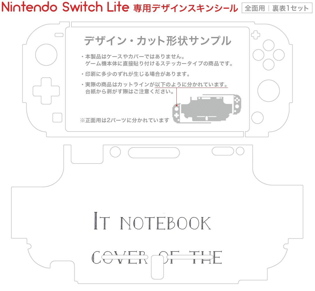 製品名 Nintendo Switch Lite専用 デザインスキンシール セット内容 Nintendo Switch Lite本体用スキンシール(裏表)各1枚 ※液晶側シールは2パーツに分かれていますニンテンドースイッチライト専用です。据え置き機のSwitch本体やJoyコンには対応していません。 商品特徴 3M社製の再剥離性シートを素材に採用し、細かな位置調整がしやすく貼り直しが容易です。また、エアフリーでもありますので気泡が簡単に逃げるので、キレイに貼ることができます。専用の業務プリンターを使い、商品画像と遜色のない美しい印刷仕上がり。 注意事項 画像はサンプルですので、ご覧の環境によっては多少色味に違いを感じる場合がございます。 イメージと違った、モニターと色味が異なるという理由での交換や返金はご対応出来かねます。スキンシールのみの販売で、ニンテンドースイッチ本体などは付属しません。シワができた場合、ドライヤーなどで軽く温め、外側に向けてシワを伸ばすように貼ってください。初回貼付時の位置調整や貼り直しは可能ですが、しっかりと押し付けて接着させた後の再剥離、再利用は保証しておりません。また接着部に油分や汚れが付着しますと角の部分は剥がれやすくなりますので、貼付時はあまり触れないようにご注意ください。無地のセミグロスシートにデザインをプリントした商品で、デコなどの加工はございません。 凹凸や光沢があるように見えたり布地や金属を素材にしたように見える商品もありますが、デザインの図版によるものです。印刷時に微妙な画像のズレが生じる場合がございます。ご注文後に1点1点制作する受注生産品の為、不良品以外のご返品や交換は固くお断りします。 商品発送 完全受注生産のハンドメイド商品となりますので、既製品と比べて発送までお時間を頂いています。 基本的に決済確認後2?3営業日、最大で10営業日での発送となります。繁忙期や休業日明けの場合はさらに時間がかかる場合があります。 その際には別途メールにてご連絡致します。メール便の場合、発送日から到着までに2?4日ほどかかる場合が多く、紛失などの保障もご対応できかねます。あらかじめご了承下さい。