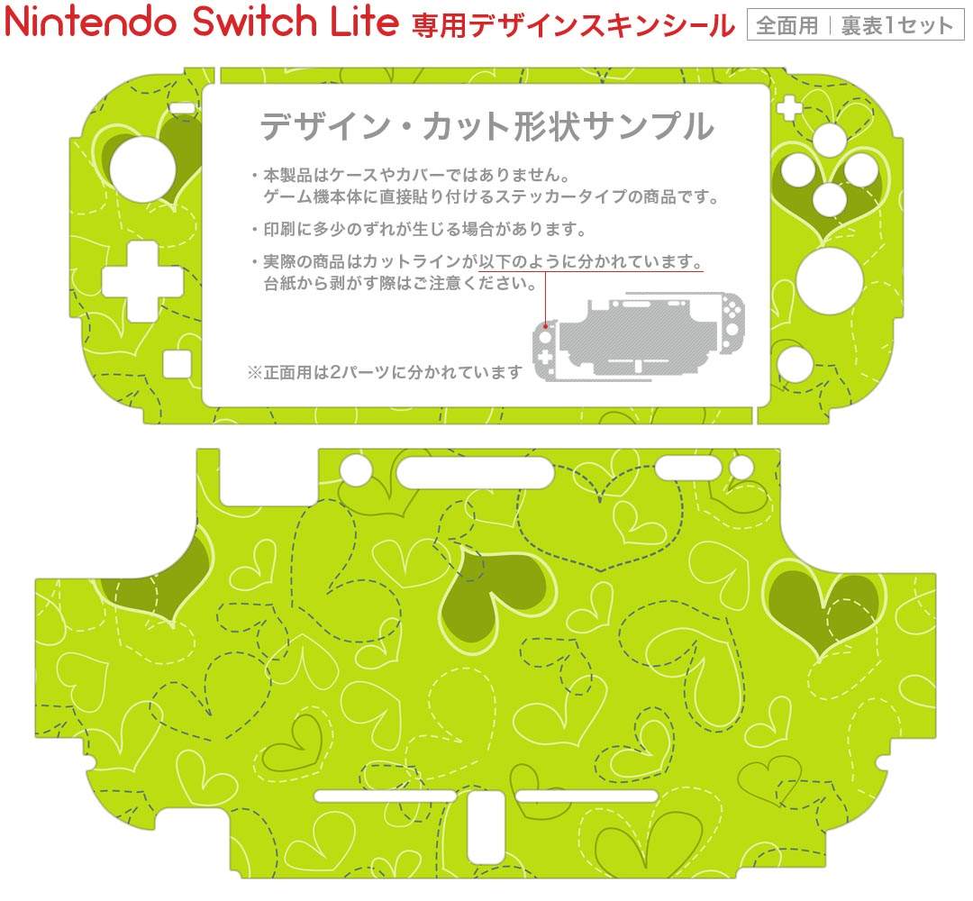 製品名 Nintendo Switch Lite専用 デザインスキンシール セット内容 Nintendo Switch Lite本体用スキンシール(裏表)各1枚 ※液晶側シールは2パーツに分かれていますニンテンドースイッチライト専用です。据え置き機のSwitch本体やJoyコンには対応していません。 商品特徴 3M社製の再剥離性シートを素材に採用し、細かな位置調整がしやすく貼り直しが容易です。また、エアフリーでもありますので気泡が簡単に逃げるので、キレイに貼ることができます。専用の業務プリンターを使い、商品画像と遜色のない美しい印刷仕上がり。 注意事項 画像はサンプルですので、ご覧の環境によっては多少色味に違いを感じる場合がございます。 イメージと違った、モニターと色味が異なるという理由での交換や返金はご対応出来かねます。スキンシールのみの販売で、ニンテンドースイッチ本体などは付属しません。シワができた場合、ドライヤーなどで軽く温め、外側に向けてシワを伸ばすように貼ってください。初回貼付時の位置調整や貼り直しは可能ですが、しっかりと押し付けて接着させた後の再剥離、再利用は保証しておりません。また接着部に油分や汚れが付着しますと角の部分は剥がれやすくなりますので、貼付時はあまり触れないようにご注意ください。無地のセミグロスシートにデザインをプリントした商品で、デコなどの加工はございません。 凹凸や光沢があるように見えたり布地や金属を素材にしたように見える商品もありますが、デザインの図版によるものです。印刷時に微妙な画像のズレが生じる場合がございます。ご注文後に1点1点制作する受注生産品の為、不良品以外のご返品や交換は固くお断りします。 商品発送 完全受注生産のハンドメイド商品となりますので、既製品と比べて発送までお時間を頂いています。 基本的に決済確認後2?3営業日、最大で10営業日での発送となります。繁忙期や休業日明けの場合はさらに時間がかかる場合があります。 その際には別途メールにてご連絡致します。メール便の場合、発送日から到着までに2?4日ほどかかる場合が多く、紛失などの保障もご対応できかねます。あらかじめご了承下さい。