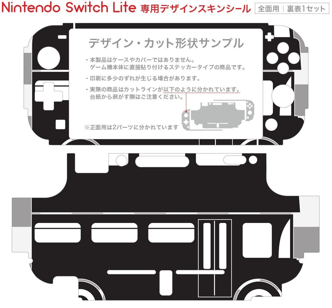 製品名 Nintendo Switch Lite専用 デザインスキンシール セット内容 Nintendo Switch Lite本体用スキンシール(裏表)各1枚 ※液晶側シールは2パーツに分かれていますニンテンドースイッチライト専用です。据え置き機のSwitch本体やJoyコンには対応していません。 商品特徴 3M社製の再剥離性シートを素材に採用し、細かな位置調整がしやすく貼り直しが容易です。また、エアフリーでもありますので気泡が簡単に逃げるので、キレイに貼ることができます。専用の業務プリンターを使い、商品画像と遜色のない美しい印刷仕上がり。 注意事項 画像はサンプルですので、ご覧の環境によっては多少色味に違いを感じる場合がございます。 イメージと違った、モニターと色味が異なるという理由での交換や返金はご対応出来かねます。スキンシールのみの販売で、ニンテンドースイッチ本体などは付属しません。シワができた場合、ドライヤーなどで軽く温め、外側に向けてシワを伸ばすように貼ってください。初回貼付時の位置調整や貼り直しは可能ですが、しっかりと押し付けて接着させた後の再剥離、再利用は保証しておりません。また接着部に油分や汚れが付着しますと角の部分は剥がれやすくなりますので、貼付時はあまり触れないようにご注意ください。無地のセミグロスシートにデザインをプリントした商品で、デコなどの加工はございません。 凹凸や光沢があるように見えたり布地や金属を素材にしたように見える商品もありますが、デザインの図版によるものです。印刷時に微妙な画像のズレが生じる場合がございます。ご注文後に1点1点制作する受注生産品の為、不良品以外のご返品や交換は固くお断りします。 商品発送 完全受注生産のハンドメイド商品となりますので、既製品と比べて発送までお時間を頂いています。 基本的に決済確認後2?3営業日、最大で10営業日での発送となります。繁忙期や休業日明けの場合はさらに時間がかかる場合があります。 その際には別途メールにてご連絡致します。メール便の場合、発送日から到着までに2?4日ほどかかる場合が多く、紛失などの保障もご対応できかねます。あらかじめご了承下さい。