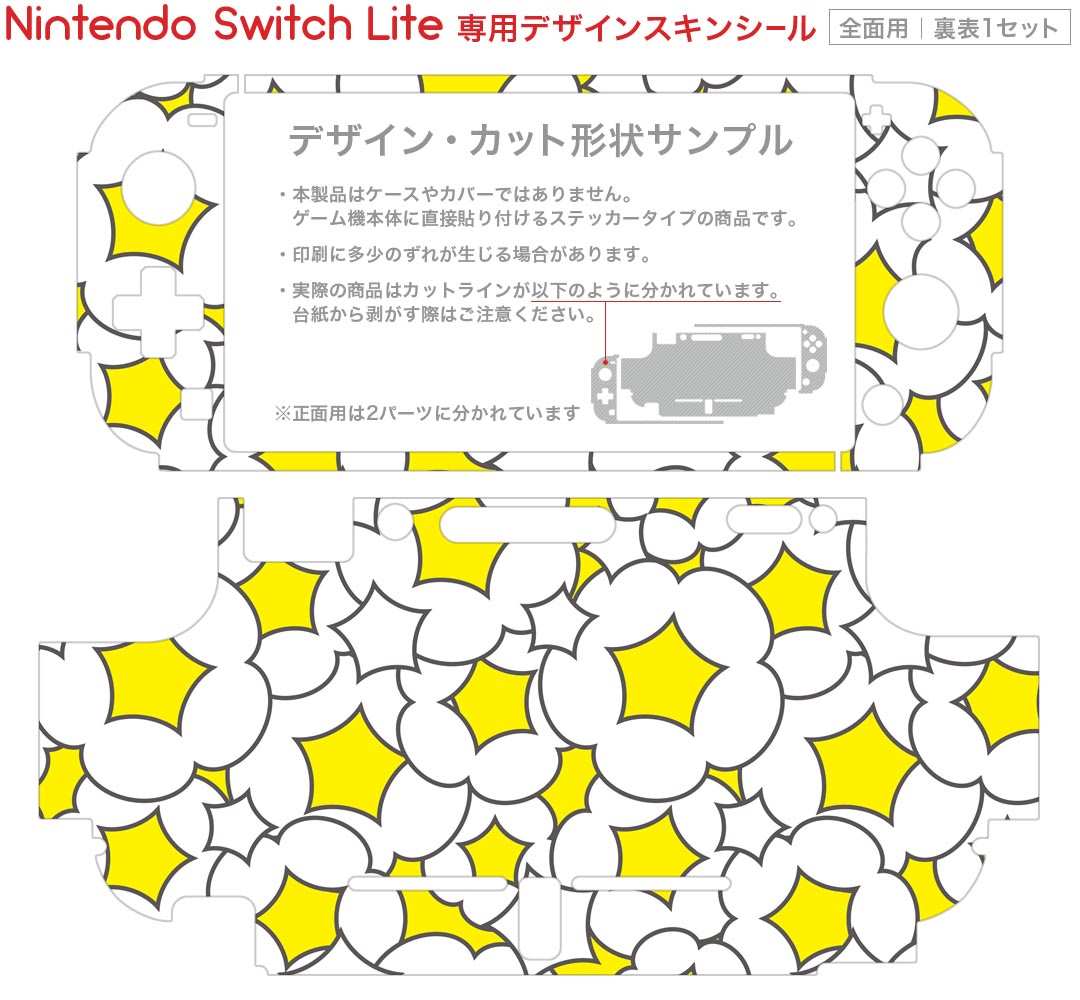 製品名 Nintendo Switch Lite専用 デザインスキンシール セット内容 Nintendo Switch Lite本体用スキンシール(裏表)各1枚 ※液晶側シールは2パーツに分かれていますニンテンドースイッチライト専用です。据え置き機のSwitch本体やJoyコンには対応していません。 商品特徴 3M社製の再剥離性シートを素材に採用し、細かな位置調整がしやすく貼り直しが容易です。また、エアフリーでもありますので気泡が簡単に逃げるので、キレイに貼ることができます。専用の業務プリンターを使い、商品画像と遜色のない美しい印刷仕上がり。 注意事項 画像はサンプルですので、ご覧の環境によっては多少色味に違いを感じる場合がございます。 イメージと違った、モニターと色味が異なるという理由での交換や返金はご対応出来かねます。スキンシールのみの販売で、ニンテンドースイッチ本体などは付属しません。シワができた場合、ドライヤーなどで軽く温め、外側に向けてシワを伸ばすように貼ってください。初回貼付時の位置調整や貼り直しは可能ですが、しっかりと押し付けて接着させた後の再剥離、再利用は保証しておりません。また接着部に油分や汚れが付着しますと角の部分は剥がれやすくなりますので、貼付時はあまり触れないようにご注意ください。無地のセミグロスシートにデザインをプリントした商品で、デコなどの加工はございません。 凹凸や光沢があるように見えたり布地や金属を素材にしたように見える商品もありますが、デザインの図版によるものです。印刷時に微妙な画像のズレが生じる場合がございます。ご注文後に1点1点制作する受注生産品の為、不良品以外のご返品や交換は固くお断りします。 商品発送 完全受注生産のハンドメイド商品となりますので、既製品と比べて発送までお時間を頂いています。 基本的に決済確認後2?3営業日、最大で10営業日での発送となります。繁忙期や休業日明けの場合はさらに時間がかかる場合があります。 その際には別途メールにてご連絡致します。メール便の場合、発送日から到着までに2?4日ほどかかる場合が多く、紛失などの保障もご対応できかねます。あらかじめご了承下さい。
