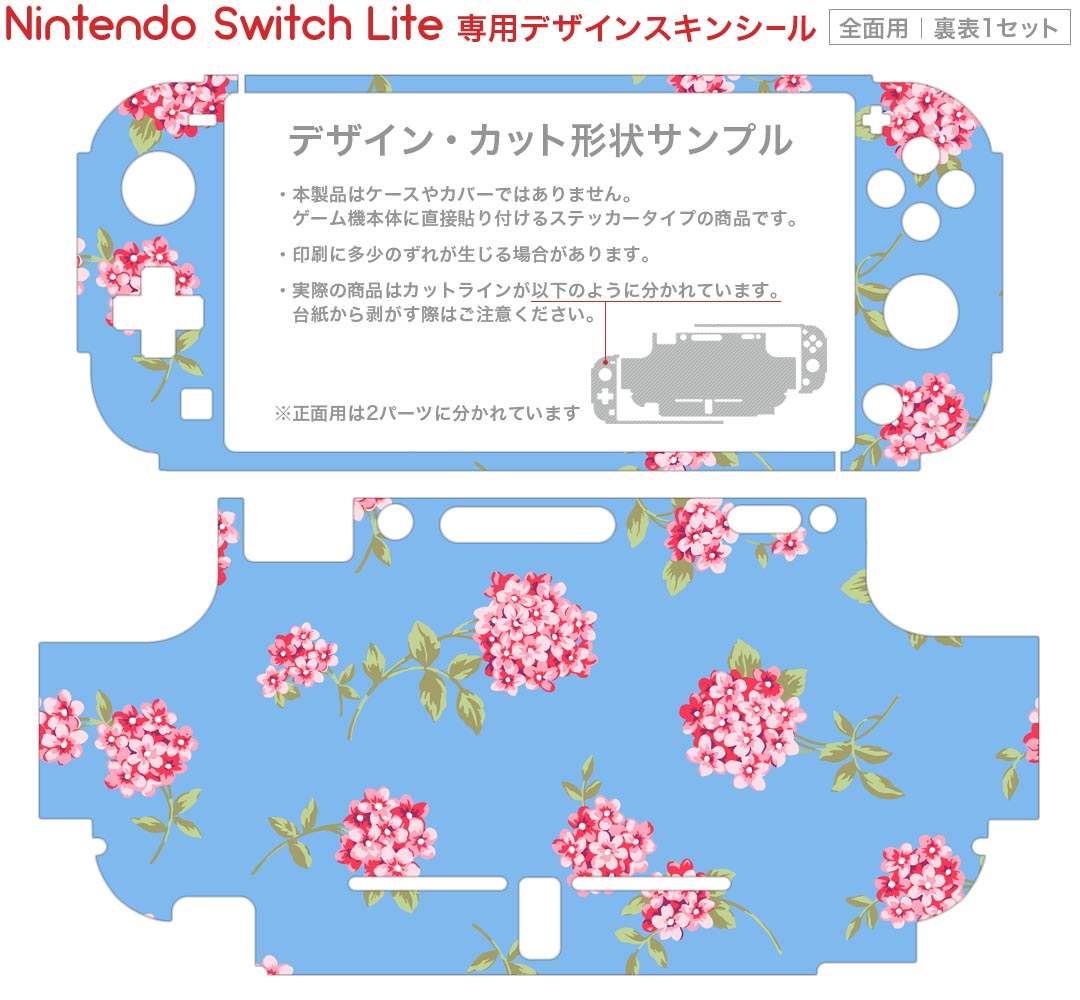 製品名 Nintendo Switch Lite専用 デザインスキンシール セット内容 Nintendo Switch Lite本体用スキンシール(裏表)各1枚 ※液晶側シールは2パーツに分かれていますニンテンドースイッチライト専用です。据え置き機のSwitch本体やJoyコンには対応していません。 商品特徴 3M社製の再剥離性シートを素材に採用し、細かな位置調整がしやすく貼り直しが容易です。また、エアフリーでもありますので気泡が簡単に逃げるので、キレイに貼ることができます。専用の業務プリンターを使い、商品画像と遜色のない美しい印刷仕上がり。 注意事項 画像はサンプルですので、ご覧の環境によっては多少色味に違いを感じる場合がございます。 イメージと違った、モニターと色味が異なるという理由での交換や返金はご対応出来かねます。スキンシールのみの販売で、ニンテンドースイッチ本体などは付属しません。シワができた場合、ドライヤーなどで軽く温め、外側に向けてシワを伸ばすように貼ってください。初回貼付時の位置調整や貼り直しは可能ですが、しっかりと押し付けて接着させた後の再剥離、再利用は保証しておりません。また接着部に油分や汚れが付着しますと角の部分は剥がれやすくなりますので、貼付時はあまり触れないようにご注意ください。無地のセミグロスシートにデザインをプリントした商品で、デコなどの加工はございません。 凹凸や光沢があるように見えたり布地や金属を素材にしたように見える商品もありますが、デザインの図版によるものです。印刷時に微妙な画像のズレが生じる場合がございます。ご注文後に1点1点制作する受注生産品の為、不良品以外のご返品や交換は固くお断りします。 商品発送 完全受注生産のハンドメイド商品となりますので、既製品と比べて発送までお時間を頂いています。 基本的に決済確認後2?3営業日、最大で10営業日での発送となります。繁忙期や休業日明けの場合はさらに時間がかかる場合があります。 その際には別途メールにてご連絡致します。メール便の場合、発送日から到着までに2?4日ほどかかる場合が多く、紛失などの保障もご対応できかねます。あらかじめご了承下さい。