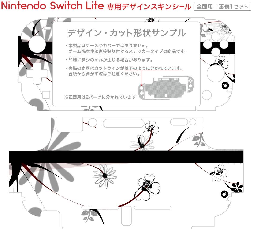 製品名 Nintendo Switch Lite専用 デザインスキンシール セット内容 Nintendo Switch Lite本体用スキンシール(裏表)各1枚 ※液晶側シールは2パーツに分かれていますニンテンドースイッチライト専用です。据え置き機のSwitch本体やJoyコンには対応していません。 商品特徴 3M社製の再剥離性シートを素材に採用し、細かな位置調整がしやすく貼り直しが容易です。また、エアフリーでもありますので気泡が簡単に逃げるので、キレイに貼ることができます。専用の業務プリンターを使い、商品画像と遜色のない美しい印刷仕上がり。 注意事項 画像はサンプルですので、ご覧の環境によっては多少色味に違いを感じる場合がございます。 イメージと違った、モニターと色味が異なるという理由での交換や返金はご対応出来かねます。スキンシールのみの販売で、ニンテンドースイッチ本体などは付属しません。シワができた場合、ドライヤーなどで軽く温め、外側に向けてシワを伸ばすように貼ってください。初回貼付時の位置調整や貼り直しは可能ですが、しっかりと押し付けて接着させた後の再剥離、再利用は保証しておりません。また接着部に油分や汚れが付着しますと角の部分は剥がれやすくなりますので、貼付時はあまり触れないようにご注意ください。無地のセミグロスシートにデザインをプリントした商品で、デコなどの加工はございません。 凹凸や光沢があるように見えたり布地や金属を素材にしたように見える商品もありますが、デザインの図版によるものです。印刷時に微妙な画像のズレが生じる場合がございます。ご注文後に1点1点制作する受注生産品の為、不良品以外のご返品や交換は固くお断りします。 商品発送 完全受注生産のハンドメイド商品となりますので、既製品と比べて発送までお時間を頂いています。 基本的に決済確認後2?3営業日、最大で10営業日での発送となります。繁忙期や休業日明けの場合はさらに時間がかかる場合があります。 その際には別途メールにてご連絡致します。メール便の場合、発送日から到着までに2?4日ほどかかる場合が多く、紛失などの保障もご対応できかねます。あらかじめご了承下さい。
