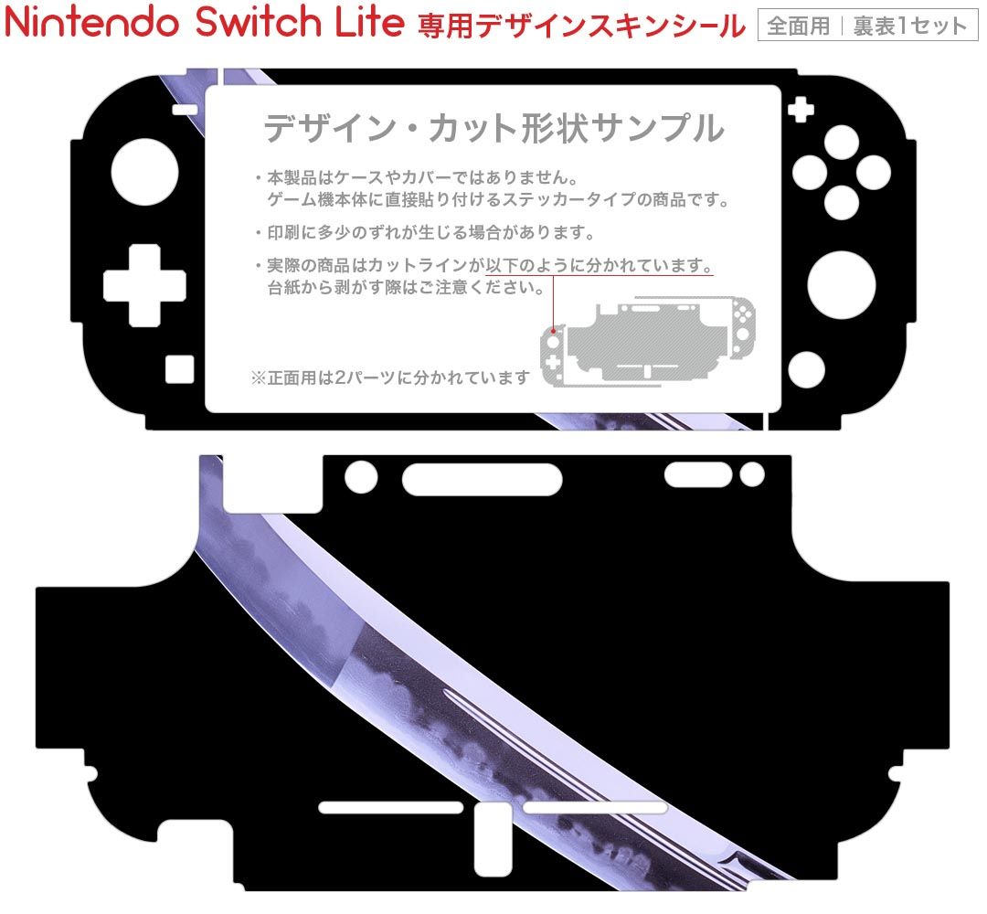 製品名 Nintendo Switch Lite専用 デザインスキンシール セット内容 Nintendo Switch Lite本体用スキンシール(裏表)各1枚 ※液晶側シールは2パーツに分かれていますニンテンドースイッチライト専用です。据え置き機のSwitch本体やJoyコンには対応していません。 商品特徴 3M社製の再剥離性シートを素材に採用し、細かな位置調整がしやすく貼り直しが容易です。また、エアフリーでもありますので気泡が簡単に逃げるので、キレイに貼ることができます。専用の業務プリンターを使い、商品画像と遜色のない美しい印刷仕上がり。 注意事項 画像はサンプルですので、ご覧の環境によっては多少色味に違いを感じる場合がございます。 イメージと違った、モニターと色味が異なるという理由での交換や返金はご対応出来かねます。スキンシールのみの販売で、ニンテンドースイッチ本体などは付属しません。シワができた場合、ドライヤーなどで軽く温め、外側に向けてシワを伸ばすように貼ってください。初回貼付時の位置調整や貼り直しは可能ですが、しっかりと押し付けて接着させた後の再剥離、再利用は保証しておりません。また接着部に油分や汚れが付着しますと角の部分は剥がれやすくなりますので、貼付時はあまり触れないようにご注意ください。無地のセミグロスシートにデザインをプリントした商品で、デコなどの加工はございません。 凹凸や光沢があるように見えたり布地や金属を素材にしたように見える商品もありますが、デザインの図版によるものです。印刷時に微妙な画像のズレが生じる場合がございます。ご注文後に1点1点制作する受注生産品の為、不良品以外のご返品や交換は固くお断りします。 商品発送 完全受注生産のハンドメイド商品となりますので、既製品と比べて発送までお時間を頂いています。 基本的に決済確認後2?3営業日、最大で10営業日での発送となります。繁忙期や休業日明けの場合はさらに時間がかかる場合があります。 その際には別途メールにてご連絡致します。メール便の場合、発送日から到着までに2?4日ほどかかる場合が多く、紛失などの保障もご対応できかねます。あらかじめご了承下さい。