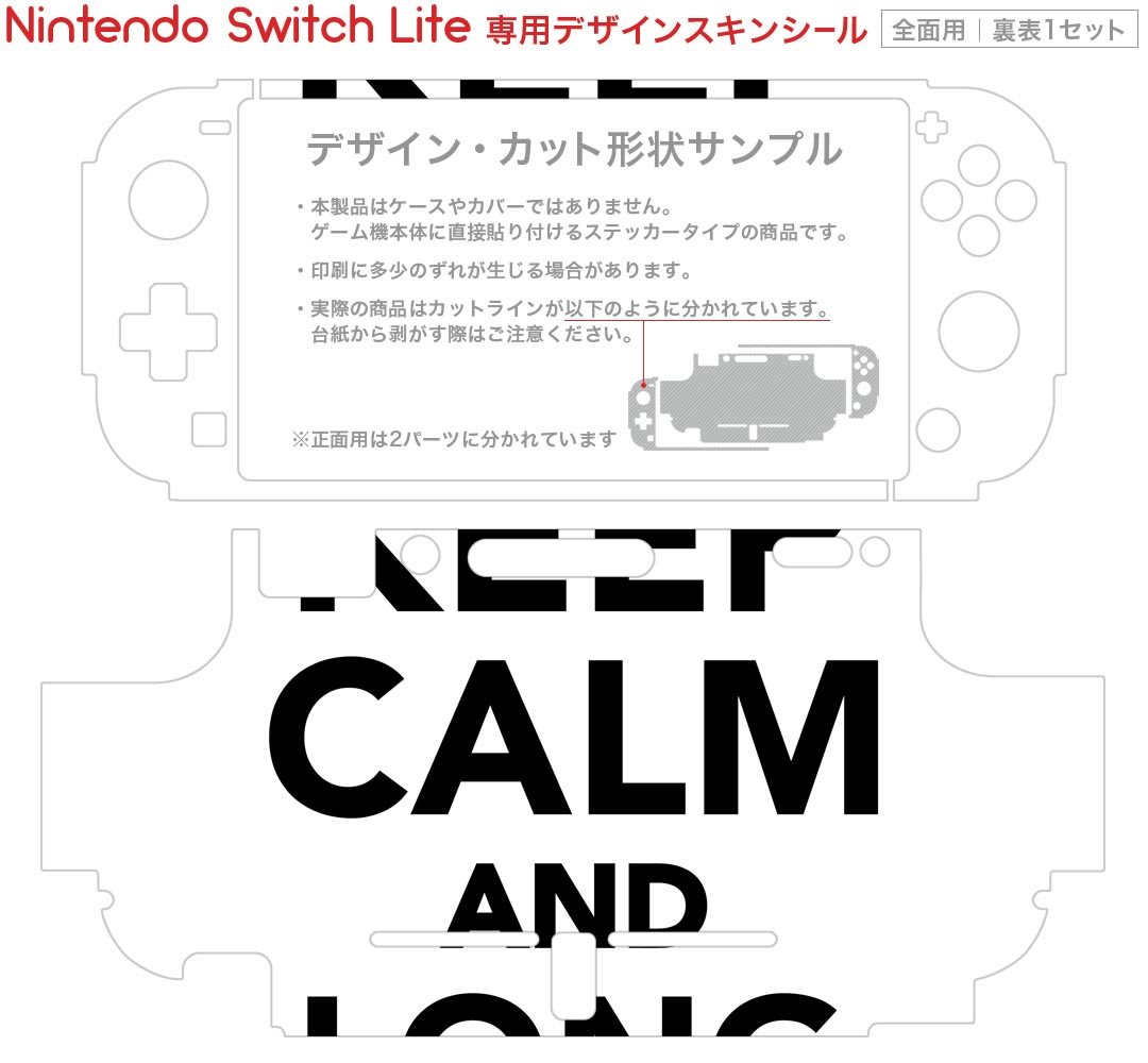 製品名 Nintendo Switch Lite専用 デザインスキンシール セット内容 Nintendo Switch Lite本体用スキンシール(裏表)各1枚 ※液晶側シールは2パーツに分かれていますニンテンドースイッチライト専用です。据え置き機のSwitch本体やJoyコンには対応していません。 商品特徴 3M社製の再剥離性シートを素材に採用し、細かな位置調整がしやすく貼り直しが容易です。また、エアフリーでもありますので気泡が簡単に逃げるので、キレイに貼ることができます。専用の業務プリンターを使い、商品画像と遜色のない美しい印刷仕上がり。 注意事項 画像はサンプルですので、ご覧の環境によっては多少色味に違いを感じる場合がございます。 イメージと違った、モニターと色味が異なるという理由での交換や返金はご対応出来かねます。スキンシールのみの販売で、ニンテンドースイッチ本体などは付属しません。シワができた場合、ドライヤーなどで軽く温め、外側に向けてシワを伸ばすように貼ってください。初回貼付時の位置調整や貼り直しは可能ですが、しっかりと押し付けて接着させた後の再剥離、再利用は保証しておりません。また接着部に油分や汚れが付着しますと角の部分は剥がれやすくなりますので、貼付時はあまり触れないようにご注意ください。無地のセミグロスシートにデザインをプリントした商品で、デコなどの加工はございません。 凹凸や光沢があるように見えたり布地や金属を素材にしたように見える商品もありますが、デザインの図版によるものです。印刷時に微妙な画像のズレが生じる場合がございます。ご注文後に1点1点制作する受注生産品の為、不良品以外のご返品や交換は固くお断りします。 商品発送 完全受注生産のハンドメイド商品となりますので、既製品と比べて発送までお時間を頂いています。 基本的に決済確認後2?3営業日、最大で10営業日での発送となります。繁忙期や休業日明けの場合はさらに時間がかかる場合があります。 その際には別途メールにてご連絡致します。メール便の場合、発送日から到着までに2?4日ほどかかる場合が多く、紛失などの保障もご対応できかねます。あらかじめご了承下さい。