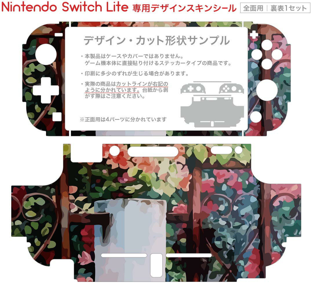 製品名 Nintendo Switch Lite専用 デザインスキンシール セット内容 Nintendo Switch Lite本体用スキンシール(裏表)各1枚 ※液晶側シールは2パーツに分かれていますニンテンドースイッチライト専用です。据え置き機のSwitch本体やJoyコンには対応していません。 商品特徴 3M社製の再剥離性シートを素材に採用し、細かな位置調整がしやすく貼り直しが容易です。また、エアフリーでもありますので気泡が簡単に逃げるので、キレイに貼ることができます。専用の業務プリンターを使い、商品画像と遜色のない美しい印刷仕上がり。 注意事項 画像はサンプルですので、ご覧の環境によっては多少色味に違いを感じる場合がございます。 イメージと違った、モニターと色味が異なるという理由での交換や返金はご対応出来かねます。スキンシールのみの販売で、ニンテンドースイッチ本体などは付属しません。シワができた場合、ドライヤーなどで軽く温め、外側に向けてシワを伸ばすように貼ってください。初回貼付時の位置調整や貼り直しは可能ですが、しっかりと押し付けて接着させた後の再剥離、再利用は保証しておりません。また接着部に油分や汚れが付着しますと角の部分は剥がれやすくなりますので、貼付時はあまり触れないようにご注意ください。無地のセミグロスシートにデザインをプリントした商品で、デコなどの加工はございません。 凹凸や光沢があるように見えたり布地や金属を素材にしたように見える商品もありますが、デザインの図版によるものです。印刷時に微妙な画像のズレが生じる場合がございます。ご注文後に1点1点制作する受注生産品の為、不良品以外のご返品や交換は固くお断りします。 商品発送 完全受注生産のハンドメイド商品となりますので、既製品と比べて発送までお時間を頂いています。 基本的に決済確認後2?3営業日、最大で10営業日での発送となります。繁忙期や休業日明けの場合はさらに時間がかかる場合があります。 その際には別途メールにてご連絡致します。メール便の場合、発送日から到着までに2?4日ほどかかる場合が多く、紛失などの保障もご対応できかねます。あらかじめご了承下さい。