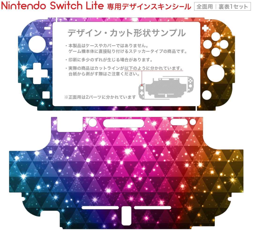 製品名 Nintendo Switch Lite専用 デザインスキンシール セット内容 Nintendo Switch Lite本体用スキンシール(裏表)各1枚 ※液晶側シールは2パーツに分かれていますニンテンドースイッチライト専用です。据え置き機のSwitch本体やJoyコンには対応していません。 商品特徴 3M社製の再剥離性シートを素材に採用し、細かな位置調整がしやすく貼り直しが容易です。また、エアフリーでもありますので気泡が簡単に逃げるので、キレイに貼ることができます。専用の業務プリンターを使い、商品画像と遜色のない美しい印刷仕上がり。 注意事項 画像はサンプルですので、ご覧の環境によっては多少色味に違いを感じる場合がございます。 イメージと違った、モニターと色味が異なるという理由での交換や返金はご対応出来かねます。スキンシールのみの販売で、ニンテンドースイッチ本体などは付属しません。シワができた場合、ドライヤーなどで軽く温め、外側に向けてシワを伸ばすように貼ってください。初回貼付時の位置調整や貼り直しは可能ですが、しっかりと押し付けて接着させた後の再剥離、再利用は保証しておりません。また接着部に油分や汚れが付着しますと角の部分は剥がれやすくなりますので、貼付時はあまり触れないようにご注意ください。無地のセミグロスシートにデザインをプリントした商品で、デコなどの加工はございません。 凹凸や光沢があるように見えたり布地や金属を素材にしたように見える商品もありますが、デザインの図版によるものです。印刷時に微妙な画像のズレが生じる場合がございます。ご注文後に1点1点制作する受注生産品の為、不良品以外のご返品や交換は固くお断りします。 商品発送 完全受注生産のハンドメイド商品となりますので、既製品と比べて発送までお時間を頂いています。 基本的に決済確認後2?3営業日、最大で10営業日での発送となります。繁忙期や休業日明けの場合はさらに時間がかかる場合があります。 その際には別途メールにてご連絡致します。メール便の場合、発送日から到着までに2?4日ほどかかる場合が多く、紛失などの保障もご対応できかねます。あらかじめご了承下さい。