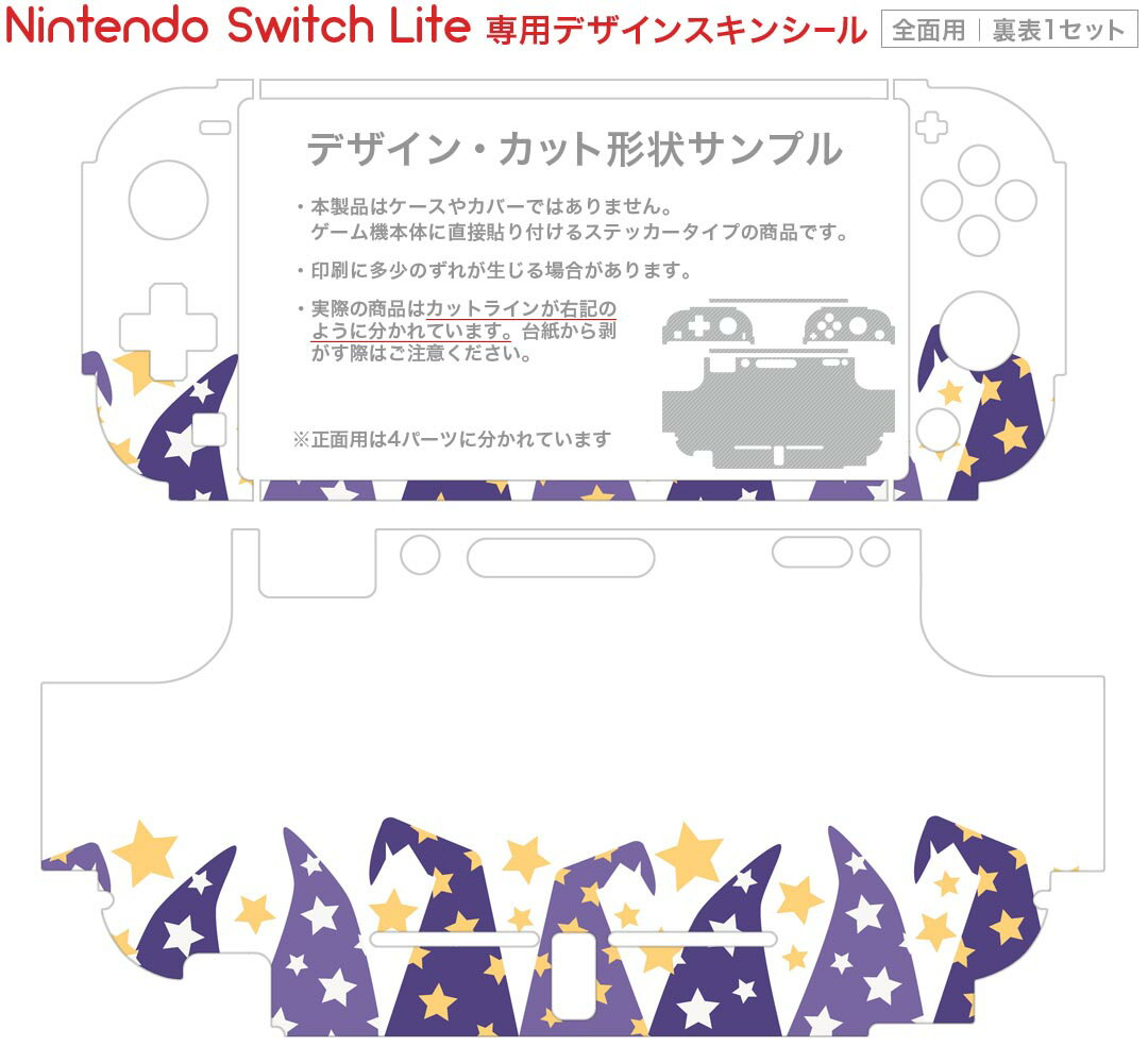 製品名 Nintendo Switch Lite専用 デザインスキンシール セット内容 Nintendo Switch Lite本体用スキンシール(裏表)各1枚 ※液晶側シールは2パーツに分かれていますニンテンドースイッチライト専用です。据え置き機のSwitch本体やJoyコンには対応していません。 商品特徴 3M社製の再剥離性シートを素材に採用し、細かな位置調整がしやすく貼り直しが容易です。また、エアフリーでもありますので気泡が簡単に逃げるので、キレイに貼ることができます。専用の業務プリンターを使い、商品画像と遜色のない美しい印刷仕上がり。 注意事項 画像はサンプルですので、ご覧の環境によっては多少色味に違いを感じる場合がございます。 イメージと違った、モニターと色味が異なるという理由での交換や返金はご対応出来かねます。スキンシールのみの販売で、ニンテンドースイッチ本体などは付属しません。シワができた場合、ドライヤーなどで軽く温め、外側に向けてシワを伸ばすように貼ってください。初回貼付時の位置調整や貼り直しは可能ですが、しっかりと押し付けて接着させた後の再剥離、再利用は保証しておりません。また接着部に油分や汚れが付着しますと角の部分は剥がれやすくなりますので、貼付時はあまり触れないようにご注意ください。無地のセミグロスシートにデザインをプリントした商品で、デコなどの加工はございません。 凹凸や光沢があるように見えたり布地や金属を素材にしたように見える商品もありますが、デザインの図版によるものです。印刷時に微妙な画像のズレが生じる場合がございます。ご注文後に1点1点制作する受注生産品の為、不良品以外のご返品や交換は固くお断りします。 商品発送 完全受注生産のハンドメイド商品となりますので、既製品と比べて発送までお時間を頂いています。 基本的に決済確認後2?3営業日、最大で10営業日での発送となります。繁忙期や休業日明けの場合はさらに時間がかかる場合があります。 その際には別途メールにてご連絡致します。メール便の場合、発送日から到着までに2?4日ほどかかる場合が多く、紛失などの保障もご対応できかねます。あらかじめご了承下さい。