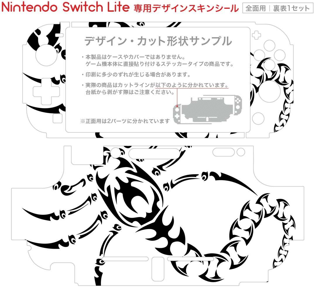 製品名 Nintendo Switch Lite専用 デザインスキンシール セット内容 Nintendo Switch Lite本体用スキンシール(裏表)各1枚 ※液晶側シールは2パーツに分かれていますニンテンドースイッチライト専用です。据え置き機のSwitch本体やJoyコンには対応していません。 商品特徴 3M社製の再剥離性シートを素材に採用し、細かな位置調整がしやすく貼り直しが容易です。また、エアフリーでもありますので気泡が簡単に逃げるので、キレイに貼ることができます。専用の業務プリンターを使い、商品画像と遜色のない美しい印刷仕上がり。 注意事項 画像はサンプルですので、ご覧の環境によっては多少色味に違いを感じる場合がございます。 イメージと違った、モニターと色味が異なるという理由での交換や返金はご対応出来かねます。スキンシールのみの販売で、ニンテンドースイッチ本体などは付属しません。シワができた場合、ドライヤーなどで軽く温め、外側に向けてシワを伸ばすように貼ってください。初回貼付時の位置調整や貼り直しは可能ですが、しっかりと押し付けて接着させた後の再剥離、再利用は保証しておりません。また接着部に油分や汚れが付着しますと角の部分は剥がれやすくなりますので、貼付時はあまり触れないようにご注意ください。無地のセミグロスシートにデザインをプリントした商品で、デコなどの加工はございません。 凹凸や光沢があるように見えたり布地や金属を素材にしたように見える商品もありますが、デザインの図版によるものです。印刷時に微妙な画像のズレが生じる場合がございます。ご注文後に1点1点制作する受注生産品の為、不良品以外のご返品や交換は固くお断りします。 商品発送 完全受注生産のハンドメイド商品となりますので、既製品と比べて発送までお時間を頂いています。 基本的に決済確認後2?3営業日、最大で10営業日での発送となります。繁忙期や休業日明けの場合はさらに時間がかかる場合があります。 その際には別途メールにてご連絡致します。メール便の場合、発送日から到着までに2?4日ほどかかる場合が多く、紛失などの保障もご対応できかねます。あらかじめご了承下さい。