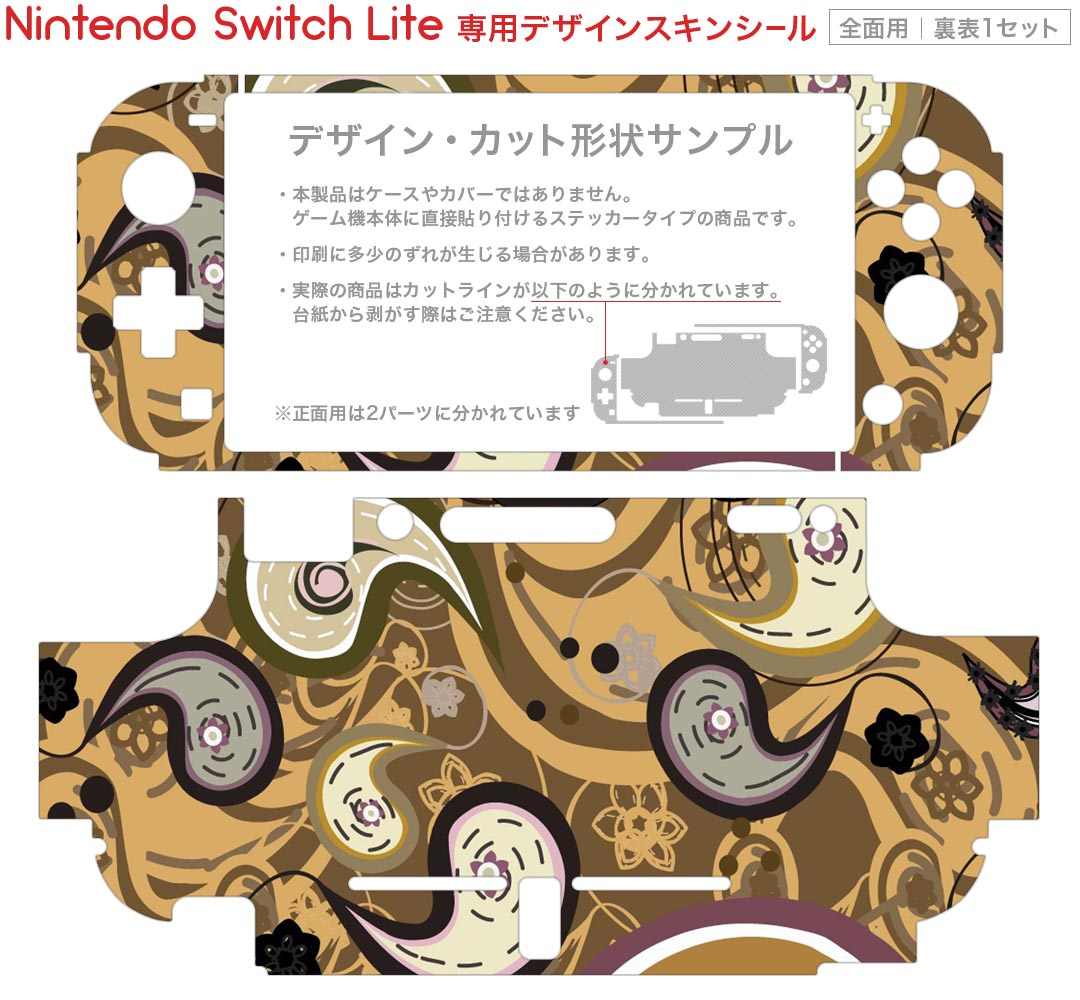 製品名 Nintendo Switch Lite専用 デザインスキンシール セット内容 Nintendo Switch Lite本体用スキンシール(裏表)各1枚 ※液晶側シールは2パーツに分かれていますニンテンドースイッチライト専用です。据え置き機のSwitch本体やJoyコンには対応していません。 商品特徴 3M社製の再剥離性シートを素材に採用し、細かな位置調整がしやすく貼り直しが容易です。また、エアフリーでもありますので気泡が簡単に逃げるので、キレイに貼ることができます。専用の業務プリンターを使い、商品画像と遜色のない美しい印刷仕上がり。 注意事項 画像はサンプルですので、ご覧の環境によっては多少色味に違いを感じる場合がございます。 イメージと違った、モニターと色味が異なるという理由での交換や返金はご対応出来かねます。スキンシールのみの販売で、ニンテンドースイッチ本体などは付属しません。シワができた場合、ドライヤーなどで軽く温め、外側に向けてシワを伸ばすように貼ってください。初回貼付時の位置調整や貼り直しは可能ですが、しっかりと押し付けて接着させた後の再剥離、再利用は保証しておりません。また接着部に油分や汚れが付着しますと角の部分は剥がれやすくなりますので、貼付時はあまり触れないようにご注意ください。無地のセミグロスシートにデザインをプリントした商品で、デコなどの加工はございません。 凹凸や光沢があるように見えたり布地や金属を素材にしたように見える商品もありますが、デザインの図版によるものです。印刷時に微妙な画像のズレが生じる場合がございます。ご注文後に1点1点制作する受注生産品の為、不良品以外のご返品や交換は固くお断りします。 商品発送 完全受注生産のハンドメイド商品となりますので、既製品と比べて発送までお時間を頂いています。 基本的に決済確認後2?3営業日、最大で10営業日での発送となります。繁忙期や休業日明けの場合はさらに時間がかかる場合があります。 その際には別途メールにてご連絡致します。メール便の場合、発送日から到着までに2?4日ほどかかる場合が多く、紛失などの保障もご対応できかねます。あらかじめご了承下さい。