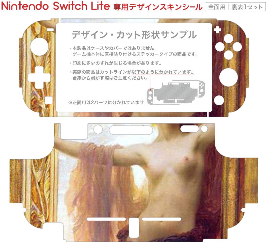 製品名 Nintendo Switch Lite専用 デザインスキンシール セット内容 Nintendo Switch Lite本体用スキンシール(裏表)各1枚 ※液晶側シールは2パーツに分かれていますニンテンドースイッチライト専用です。据え置き機のSwitch本体やJoyコンには対応していません。 商品特徴 3M社製の再剥離性シートを素材に採用し、細かな位置調整がしやすく貼り直しが容易です。また、エアフリーでもありますので気泡が簡単に逃げるので、キレイに貼ることができます。専用の業務プリンターを使い、商品画像と遜色のない美しい印刷仕上がり。 注意事項 画像はサンプルですので、ご覧の環境によっては多少色味に違いを感じる場合がございます。 イメージと違った、モニターと色味が異なるという理由での交換や返金はご対応出来かねます。スキンシールのみの販売で、ニンテンドースイッチ本体などは付属しません。シワができた場合、ドライヤーなどで軽く温め、外側に向けてシワを伸ばすように貼ってください。初回貼付時の位置調整や貼り直しは可能ですが、しっかりと押し付けて接着させた後の再剥離、再利用は保証しておりません。また接着部に油分や汚れが付着しますと角の部分は剥がれやすくなりますので、貼付時はあまり触れないようにご注意ください。無地のセミグロスシートにデザインをプリントした商品で、デコなどの加工はございません。 凹凸や光沢があるように見えたり布地や金属を素材にしたように見える商品もありますが、デザインの図版によるものです。印刷時に微妙な画像のズレが生じる場合がございます。ご注文後に1点1点制作する受注生産品の為、不良品以外のご返品や交換は固くお断りします。 商品発送 完全受注生産のハンドメイド商品となりますので、既製品と比べて発送までお時間を頂いています。 基本的に決済確認後2?3営業日、最大で10営業日での発送となります。繁忙期や休業日明けの場合はさらに時間がかかる場合があります。 その際には別途メールにてご連絡致します。メール便の場合、発送日から到着までに2?4日ほどかかる場合が多く、紛失などの保障もご対応できかねます。あらかじめご了承下さい。