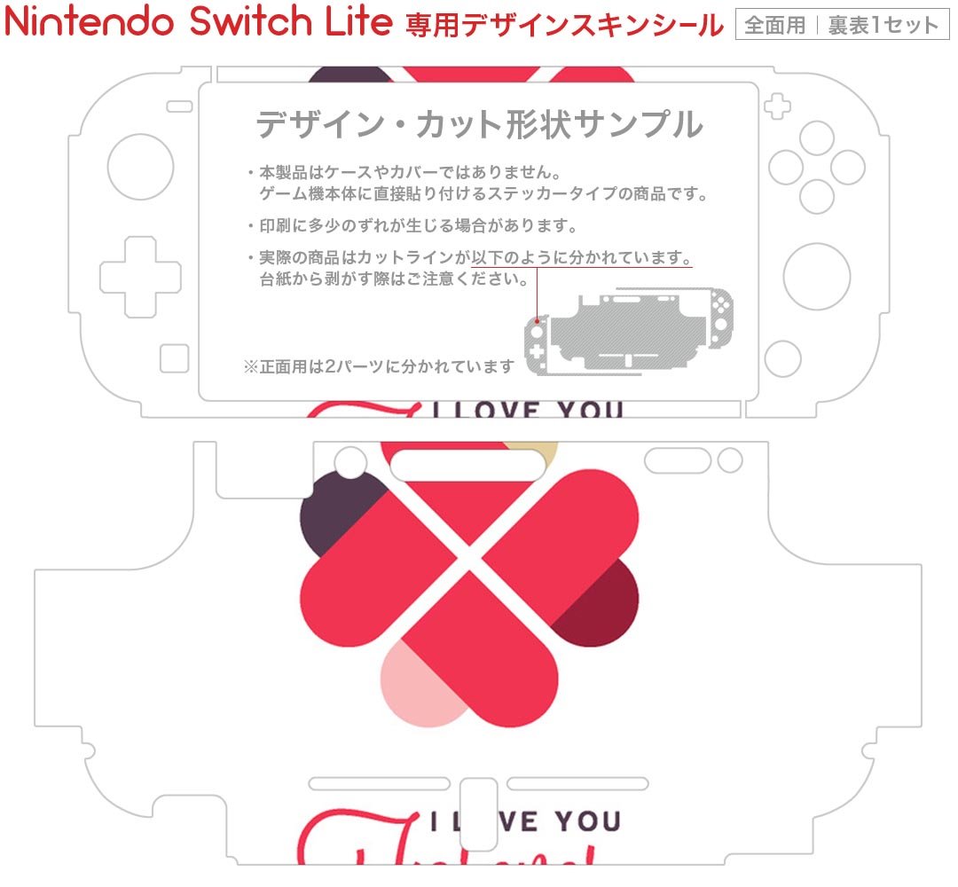 製品名 Nintendo Switch Lite専用 デザインスキンシール セット内容 Nintendo Switch Lite本体用スキンシール(裏表)各1枚 ※液晶側シールは2パーツに分かれていますニンテンドースイッチライト専用です。据え置き機のSwitch本体やJoyコンには対応していません。 商品特徴 3M社製の再剥離性シートを素材に採用し、細かな位置調整がしやすく貼り直しが容易です。また、エアフリーでもありますので気泡が簡単に逃げるので、キレイに貼ることができます。専用の業務プリンターを使い、商品画像と遜色のない美しい印刷仕上がり。 注意事項 画像はサンプルですので、ご覧の環境によっては多少色味に違いを感じる場合がございます。 イメージと違った、モニターと色味が異なるという理由での交換や返金はご対応出来かねます。スキンシールのみの販売で、ニンテンドースイッチ本体などは付属しません。シワができた場合、ドライヤーなどで軽く温め、外側に向けてシワを伸ばすように貼ってください。初回貼付時の位置調整や貼り直しは可能ですが、しっかりと押し付けて接着させた後の再剥離、再利用は保証しておりません。また接着部に油分や汚れが付着しますと角の部分は剥がれやすくなりますので、貼付時はあまり触れないようにご注意ください。無地のセミグロスシートにデザインをプリントした商品で、デコなどの加工はございません。 凹凸や光沢があるように見えたり布地や金属を素材にしたように見える商品もありますが、デザインの図版によるものです。印刷時に微妙な画像のズレが生じる場合がございます。ご注文後に1点1点制作する受注生産品の為、不良品以外のご返品や交換は固くお断りします。 商品発送 完全受注生産のハンドメイド商品となりますので、既製品と比べて発送までお時間を頂いています。 基本的に決済確認後2?3営業日、最大で10営業日での発送となります。繁忙期や休業日明けの場合はさらに時間がかかる場合があります。 その際には別途メールにてご連絡致します。メール便の場合、発送日から到着までに2?4日ほどかかる場合が多く、紛失などの保障もご対応できかねます。あらかじめご了承下さい。