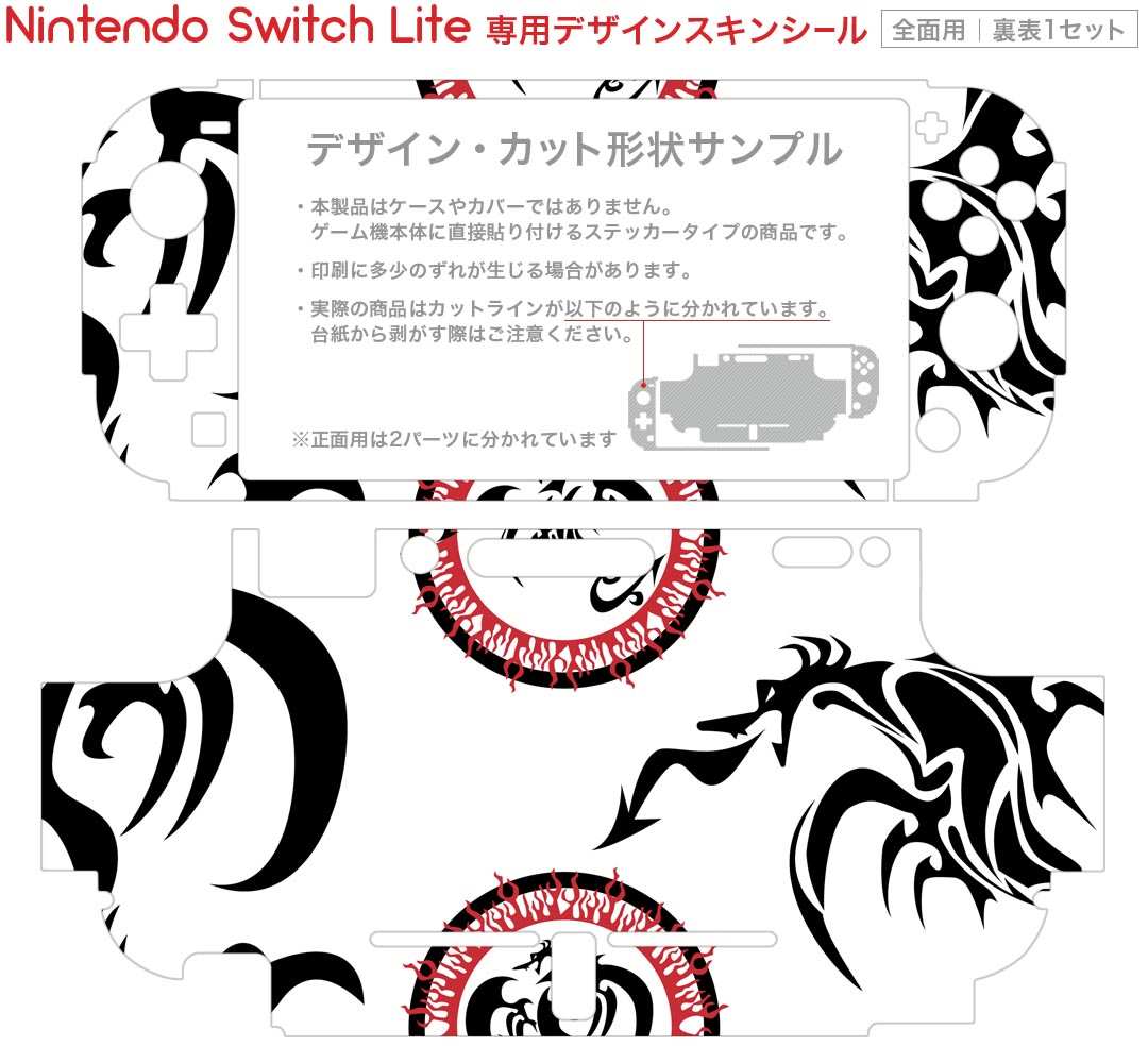 製品名 Nintendo Switch Lite専用 デザインスキンシール セット内容 Nintendo Switch Lite本体用スキンシール(裏表)各1枚 ※液晶側シールは2パーツに分かれていますニンテンドースイッチライト専用です。据え置き機のSwitch本体やJoyコンには対応していません。 商品特徴 3M社製の再剥離性シートを素材に採用し、細かな位置調整がしやすく貼り直しが容易です。また、エアフリーでもありますので気泡が簡単に逃げるので、キレイに貼ることができます。専用の業務プリンターを使い、商品画像と遜色のない美しい印刷仕上がり。 注意事項 画像はサンプルですので、ご覧の環境によっては多少色味に違いを感じる場合がございます。 イメージと違った、モニターと色味が異なるという理由での交換や返金はご対応出来かねます。スキンシールのみの販売で、ニンテンドースイッチ本体などは付属しません。シワができた場合、ドライヤーなどで軽く温め、外側に向けてシワを伸ばすように貼ってください。初回貼付時の位置調整や貼り直しは可能ですが、しっかりと押し付けて接着させた後の再剥離、再利用は保証しておりません。また接着部に油分や汚れが付着しますと角の部分は剥がれやすくなりますので、貼付時はあまり触れないようにご注意ください。無地のセミグロスシートにデザインをプリントした商品で、デコなどの加工はございません。 凹凸や光沢があるように見えたり布地や金属を素材にしたように見える商品もありますが、デザインの図版によるものです。印刷時に微妙な画像のズレが生じる場合がございます。ご注文後に1点1点制作する受注生産品の為、不良品以外のご返品や交換は固くお断りします。 商品発送 完全受注生産のハンドメイド商品となりますので、既製品と比べて発送までお時間を頂いています。 基本的に決済確認後2?3営業日、最大で10営業日での発送となります。繁忙期や休業日明けの場合はさらに時間がかかる場合があります。 その際には別途メールにてご連絡致します。メール便の場合、発送日から到着までに2?4日ほどかかる場合が多く、紛失などの保障もご対応できかねます。あらかじめご了承下さい。