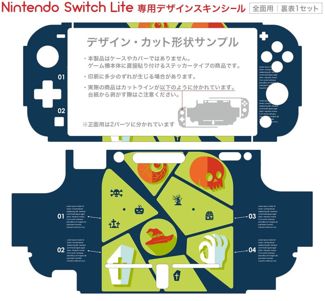 製品名 Nintendo Switch Lite専用 デザインスキンシール セット内容 Nintendo Switch Lite本体用スキンシール(裏表)各1枚 ※液晶側シールは2パーツに分かれていますニンテンドースイッチライト専用です。据え置き機のSwitch本体やJoyコンには対応していません。 商品特徴 3M社製の再剥離性シートを素材に採用し、細かな位置調整がしやすく貼り直しが容易です。また、エアフリーでもありますので気泡が簡単に逃げるので、キレイに貼ることができます。専用の業務プリンターを使い、商品画像と遜色のない美しい印刷仕上がり。 注意事項 画像はサンプルですので、ご覧の環境によっては多少色味に違いを感じる場合がございます。 イメージと違った、モニターと色味が異なるという理由での交換や返金はご対応出来かねます。スキンシールのみの販売で、ニンテンドースイッチ本体などは付属しません。シワができた場合、ドライヤーなどで軽く温め、外側に向けてシワを伸ばすように貼ってください。初回貼付時の位置調整や貼り直しは可能ですが、しっかりと押し付けて接着させた後の再剥離、再利用は保証しておりません。また接着部に油分や汚れが付着しますと角の部分は剥がれやすくなりますので、貼付時はあまり触れないようにご注意ください。無地のセミグロスシートにデザインをプリントした商品で、デコなどの加工はございません。 凹凸や光沢があるように見えたり布地や金属を素材にしたように見える商品もありますが、デザインの図版によるものです。印刷時に微妙な画像のズレが生じる場合がございます。ご注文後に1点1点制作する受注生産品の為、不良品以外のご返品や交換は固くお断りします。 商品発送 完全受注生産のハンドメイド商品となりますので、既製品と比べて発送までお時間を頂いています。 基本的に決済確認後2?3営業日、最大で10営業日での発送となります。繁忙期や休業日明けの場合はさらに時間がかかる場合があります。 その際には別途メールにてご連絡致します。メール便の場合、発送日から到着までに2?4日ほどかかる場合が多く、紛失などの保障もご対応できかねます。あらかじめご了承下さい。