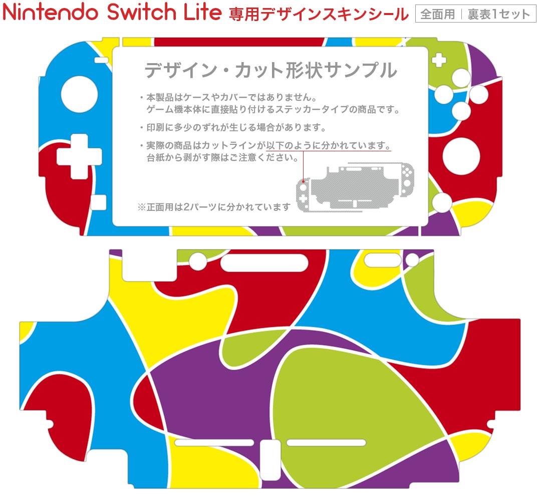 製品名 Nintendo Switch Lite専用 デザインスキンシール セット内容 Nintendo Switch Lite本体用スキンシール(裏表)各1枚 ※液晶側シールは2パーツに分かれていますニンテンドースイッチライト専用です。据え置き機のSwitch本体やJoyコンには対応していません。 商品特徴 3M社製の再剥離性シートを素材に採用し、細かな位置調整がしやすく貼り直しが容易です。また、エアフリーでもありますので気泡が簡単に逃げるので、キレイに貼ることができます。専用の業務プリンターを使い、商品画像と遜色のない美しい印刷仕上がり。 注意事項 画像はサンプルですので、ご覧の環境によっては多少色味に違いを感じる場合がございます。 イメージと違った、モニターと色味が異なるという理由での交換や返金はご対応出来かねます。スキンシールのみの販売で、ニンテンドースイッチ本体などは付属しません。シワができた場合、ドライヤーなどで軽く温め、外側に向けてシワを伸ばすように貼ってください。初回貼付時の位置調整や貼り直しは可能ですが、しっかりと押し付けて接着させた後の再剥離、再利用は保証しておりません。また接着部に油分や汚れが付着しますと角の部分は剥がれやすくなりますので、貼付時はあまり触れないようにご注意ください。無地のセミグロスシートにデザインをプリントした商品で、デコなどの加工はございません。 凹凸や光沢があるように見えたり布地や金属を素材にしたように見える商品もありますが、デザインの図版によるものです。印刷時に微妙な画像のズレが生じる場合がございます。ご注文後に1点1点制作する受注生産品の為、不良品以外のご返品や交換は固くお断りします。 商品発送 完全受注生産のハンドメイド商品となりますので、既製品と比べて発送までお時間を頂いています。 基本的に決済確認後2?3営業日、最大で10営業日での発送となります。繁忙期や休業日明けの場合はさらに時間がかかる場合があります。 その際には別途メールにてご連絡致します。メール便の場合、発送日から到着までに2?4日ほどかかる場合が多く、紛失などの保障もご対応できかねます。あらかじめご了承下さい。