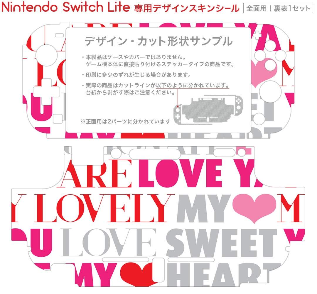 製品名 Nintendo Switch Lite専用 デザインスキンシール セット内容 Nintendo Switch Lite本体用スキンシール(裏表)各1枚 ※液晶側シールは2パーツに分かれていますニンテンドースイッチライト専用です。据え置き機のSwitch本体やJoyコンには対応していません。 商品特徴 3M社製の再剥離性シートを素材に採用し、細かな位置調整がしやすく貼り直しが容易です。また、エアフリーでもありますので気泡が簡単に逃げるので、キレイに貼ることができます。専用の業務プリンターを使い、商品画像と遜色のない美しい印刷仕上がり。 注意事項 画像はサンプルですので、ご覧の環境によっては多少色味に違いを感じる場合がございます。 イメージと違った、モニターと色味が異なるという理由での交換や返金はご対応出来かねます。スキンシールのみの販売で、ニンテンドースイッチ本体などは付属しません。シワができた場合、ドライヤーなどで軽く温め、外側に向けてシワを伸ばすように貼ってください。初回貼付時の位置調整や貼り直しは可能ですが、しっかりと押し付けて接着させた後の再剥離、再利用は保証しておりません。また接着部に油分や汚れが付着しますと角の部分は剥がれやすくなりますので、貼付時はあまり触れないようにご注意ください。無地のセミグロスシートにデザインをプリントした商品で、デコなどの加工はございません。 凹凸や光沢があるように見えたり布地や金属を素材にしたように見える商品もありますが、デザインの図版によるものです。印刷時に微妙な画像のズレが生じる場合がございます。ご注文後に1点1点制作する受注生産品の為、不良品以外のご返品や交換は固くお断りします。 商品発送 完全受注生産のハンドメイド商品となりますので、既製品と比べて発送までお時間を頂いています。 基本的に決済確認後2?3営業日、最大で10営業日での発送となります。繁忙期や休業日明けの場合はさらに時間がかかる場合があります。 その際には別途メールにてご連絡致します。メール便の場合、発送日から到着までに2?4日ほどかかる場合が多く、紛失などの保障もご対応できかねます。あらかじめご了承下さい。