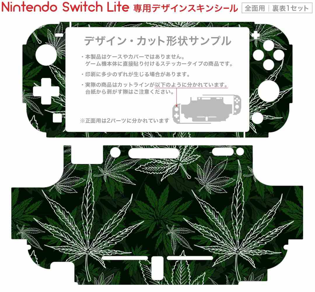 製品名 Nintendo Switch Lite専用 デザインスキンシール セット内容 Nintendo Switch Lite本体用スキンシール(裏表)各1枚 ※液晶側シールは2パーツに分かれていますニンテンドースイッチライト専用です。据え置き機のSwitch本体やJoyコンには対応していません。 商品特徴 3M社製の再剥離性シートを素材に採用し、細かな位置調整がしやすく貼り直しが容易です。また、エアフリーでもありますので気泡が簡単に逃げるので、キレイに貼ることができます。専用の業務プリンターを使い、商品画像と遜色のない美しい印刷仕上がり。 注意事項 画像はサンプルですので、ご覧の環境によっては多少色味に違いを感じる場合がございます。 イメージと違った、モニターと色味が異なるという理由での交換や返金はご対応出来かねます。スキンシールのみの販売で、ニンテンドースイッチ本体などは付属しません。シワができた場合、ドライヤーなどで軽く温め、外側に向けてシワを伸ばすように貼ってください。初回貼付時の位置調整や貼り直しは可能ですが、しっかりと押し付けて接着させた後の再剥離、再利用は保証しておりません。また接着部に油分や汚れが付着しますと角の部分は剥がれやすくなりますので、貼付時はあまり触れないようにご注意ください。無地のセミグロスシートにデザインをプリントした商品で、デコなどの加工はございません。 凹凸や光沢があるように見えたり布地や金属を素材にしたように見える商品もありますが、デザインの図版によるものです。印刷時に微妙な画像のズレが生じる場合がございます。ご注文後に1点1点制作する受注生産品の為、不良品以外のご返品や交換は固くお断りします。 商品発送 完全受注生産のハンドメイド商品となりますので、既製品と比べて発送までお時間を頂いています。 基本的に決済確認後2?3営業日、最大で10営業日での発送となります。繁忙期や休業日明けの場合はさらに時間がかかる場合があります。 その際には別途メールにてご連絡致します。メール便の場合、発送日から到着までに2?4日ほどかかる場合が多く、紛失などの保障もご対応できかねます。あらかじめご了承下さい。