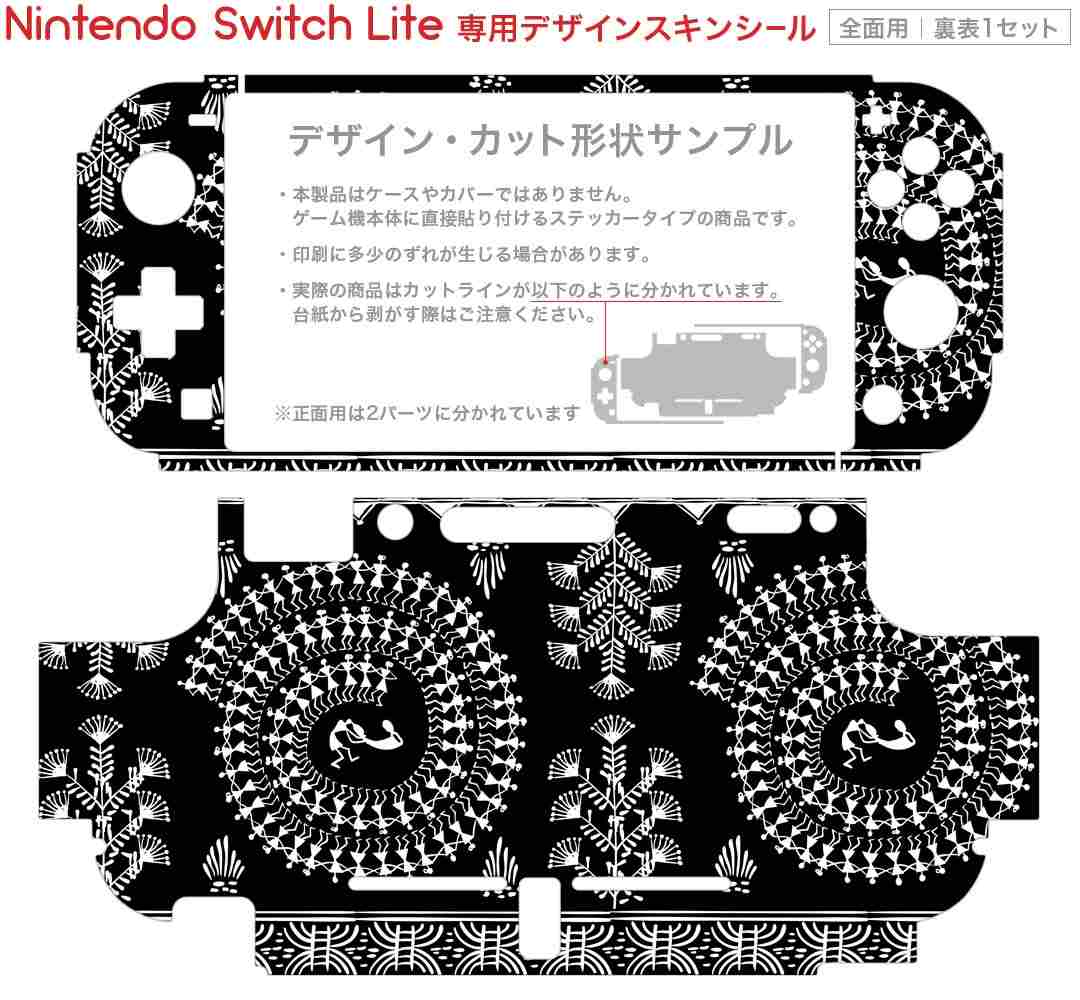 製品名 Nintendo Switch Lite専用 デザインスキンシール セット内容 Nintendo Switch Lite本体用スキンシール(裏表)各1枚 ※液晶側シールは2パーツに分かれていますニンテンドースイッチライト専用です。据え置き機のSwitch本体やJoyコンには対応していません。 商品特徴 3M社製の再剥離性シートを素材に採用し、細かな位置調整がしやすく貼り直しが容易です。また、エアフリーでもありますので気泡が簡単に逃げるので、キレイに貼ることができます。専用の業務プリンターを使い、商品画像と遜色のない美しい印刷仕上がり。 注意事項 画像はサンプルですので、ご覧の環境によっては多少色味に違いを感じる場合がございます。 イメージと違った、モニターと色味が異なるという理由での交換や返金はご対応出来かねます。スキンシールのみの販売で、ニンテンドースイッチ本体などは付属しません。シワができた場合、ドライヤーなどで軽く温め、外側に向けてシワを伸ばすように貼ってください。初回貼付時の位置調整や貼り直しは可能ですが、しっかりと押し付けて接着させた後の再剥離、再利用は保証しておりません。また接着部に油分や汚れが付着しますと角の部分は剥がれやすくなりますので、貼付時はあまり触れないようにご注意ください。無地のセミグロスシートにデザインをプリントした商品で、デコなどの加工はございません。 凹凸や光沢があるように見えたり布地や金属を素材にしたように見える商品もありますが、デザインの図版によるものです。印刷時に微妙な画像のズレが生じる場合がございます。ご注文後に1点1点制作する受注生産品の為、不良品以外のご返品や交換は固くお断りします。 商品発送 完全受注生産のハンドメイド商品となりますので、既製品と比べて発送までお時間を頂いています。 基本的に決済確認後2?3営業日、最大で10営業日での発送となります。繁忙期や休業日明けの場合はさらに時間がかかる場合があります。 その際には別途メールにてご連絡致します。メール便の場合、発送日から到着までに2?4日ほどかかる場合が多く、紛失などの保障もご対応できかねます。あらかじめご了承下さい。