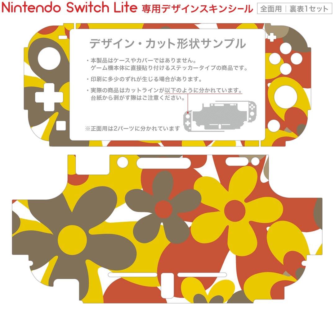 製品名 Nintendo Switch Lite専用 デザインスキンシール セット内容 Nintendo Switch Lite本体用スキンシール(裏表)各1枚 ※液晶側シールは2パーツに分かれていますニンテンドースイッチライト専用です。据え置き機のSwitch本体やJoyコンには対応していません。 商品特徴 3M社製の再剥離性シートを素材に採用し、細かな位置調整がしやすく貼り直しが容易です。また、エアフリーでもありますので気泡が簡単に逃げるので、キレイに貼ることができます。専用の業務プリンターを使い、商品画像と遜色のない美しい印刷仕上がり。 注意事項 画像はサンプルですので、ご覧の環境によっては多少色味に違いを感じる場合がございます。 イメージと違った、モニターと色味が異なるという理由での交換や返金はご対応出来かねます。スキンシールのみの販売で、ニンテンドースイッチ本体などは付属しません。シワができた場合、ドライヤーなどで軽く温め、外側に向けてシワを伸ばすように貼ってください。初回貼付時の位置調整や貼り直しは可能ですが、しっかりと押し付けて接着させた後の再剥離、再利用は保証しておりません。また接着部に油分や汚れが付着しますと角の部分は剥がれやすくなりますので、貼付時はあまり触れないようにご注意ください。無地のセミグロスシートにデザインをプリントした商品で、デコなどの加工はございません。 凹凸や光沢があるように見えたり布地や金属を素材にしたように見える商品もありますが、デザインの図版によるものです。印刷時に微妙な画像のズレが生じる場合がございます。ご注文後に1点1点制作する受注生産品の為、不良品以外のご返品や交換は固くお断りします。 商品発送 完全受注生産のハンドメイド商品となりますので、既製品と比べて発送までお時間を頂いています。 基本的に決済確認後2?3営業日、最大で10営業日での発送となります。繁忙期や休業日明けの場合はさらに時間がかかる場合があります。 その際には別途メールにてご連絡致します。メール便の場合、発送日から到着までに2?4日ほどかかる場合が多く、紛失などの保障もご対応できかねます。あらかじめご了承下さい。