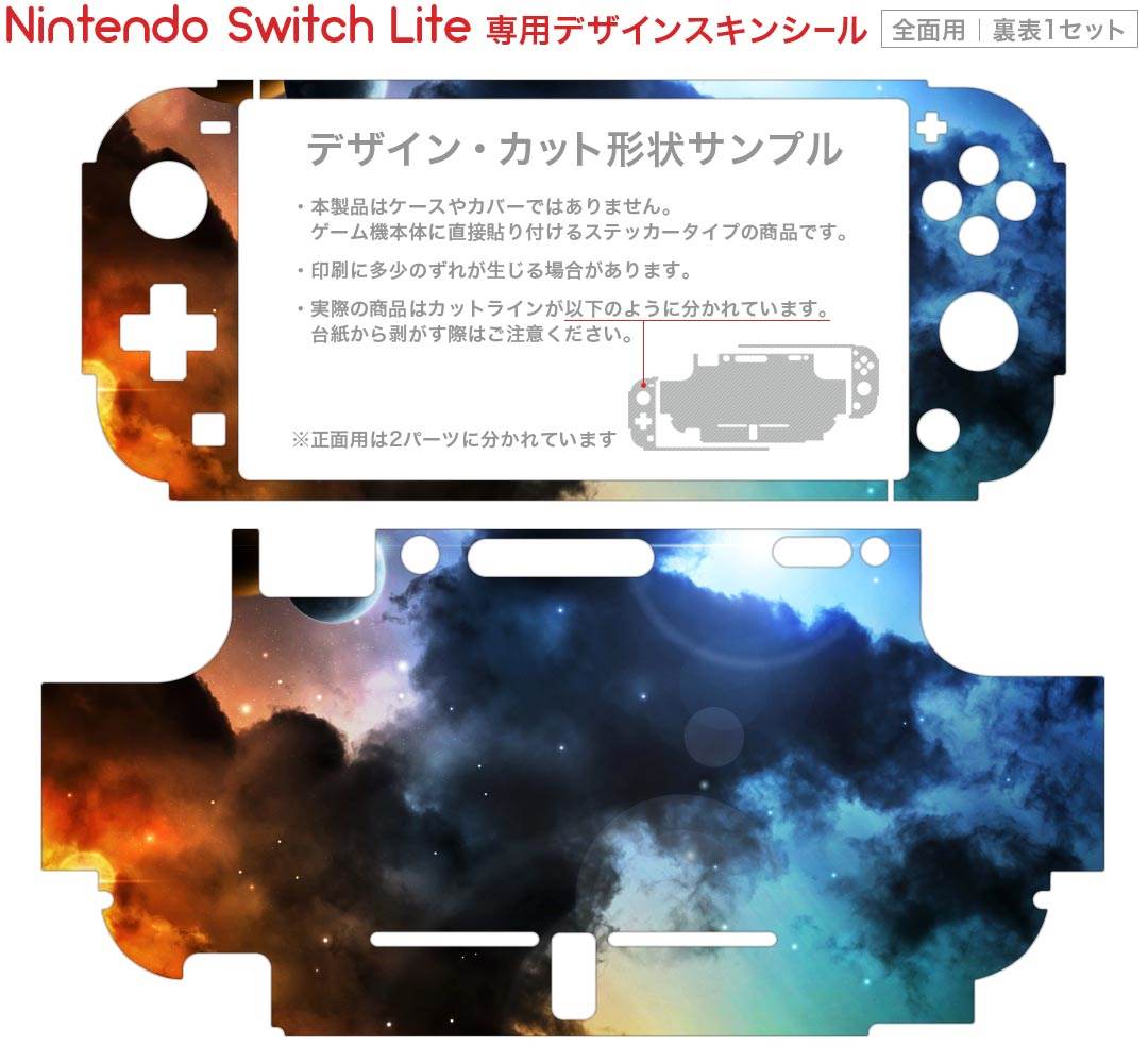 製品名 Nintendo Switch Lite専用 デザインスキンシール セット内容 Nintendo Switch Lite本体用スキンシール(裏表)各1枚 ※液晶側シールは2パーツに分かれていますニンテンドースイッチライト専用です。据え置き機のSwitch本体やJoyコンには対応していません。 商品特徴 3M社製の再剥離性シートを素材に採用し、細かな位置調整がしやすく貼り直しが容易です。また、エアフリーでもありますので気泡が簡単に逃げるので、キレイに貼ることができます。専用の業務プリンターを使い、商品画像と遜色のない美しい印刷仕上がり。 注意事項 画像はサンプルですので、ご覧の環境によっては多少色味に違いを感じる場合がございます。 イメージと違った、モニターと色味が異なるという理由での交換や返金はご対応出来かねます。スキンシールのみの販売で、ニンテンドースイッチ本体などは付属しません。シワができた場合、ドライヤーなどで軽く温め、外側に向けてシワを伸ばすように貼ってください。初回貼付時の位置調整や貼り直しは可能ですが、しっかりと押し付けて接着させた後の再剥離、再利用は保証しておりません。また接着部に油分や汚れが付着しますと角の部分は剥がれやすくなりますので、貼付時はあまり触れないようにご注意ください。無地のセミグロスシートにデザインをプリントした商品で、デコなどの加工はございません。 凹凸や光沢があるように見えたり布地や金属を素材にしたように見える商品もありますが、デザインの図版によるものです。印刷時に微妙な画像のズレが生じる場合がございます。ご注文後に1点1点制作する受注生産品の為、不良品以外のご返品や交換は固くお断りします。 商品発送 完全受注生産のハンドメイド商品となりますので、既製品と比べて発送までお時間を頂いています。 基本的に決済確認後2?3営業日、最大で10営業日での発送となります。繁忙期や休業日明けの場合はさらに時間がかかる場合があります。 その際には別途メールにてご連絡致します。メール便の場合、発送日から到着までに2?4日ほどかかる場合が多く、紛失などの保障もご対応できかねます。あらかじめご了承下さい。