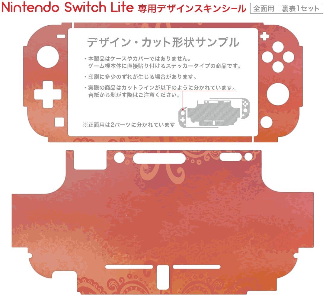 製品名 Nintendo Switch Lite専用 デザインスキンシール セット内容 Nintendo Switch Lite本体用スキンシール(裏表)各1枚 ※液晶側シールは2パーツに分かれていますニンテンドースイッチライト専用です。据え置き機のSwitch本体やJoyコンには対応していません。 商品特徴 3M社製の再剥離性シートを素材に採用し、細かな位置調整がしやすく貼り直しが容易です。また、エアフリーでもありますので気泡が簡単に逃げるので、キレイに貼ることができます。専用の業務プリンターを使い、商品画像と遜色のない美しい印刷仕上がり。 注意事項 画像はサンプルですので、ご覧の環境によっては多少色味に違いを感じる場合がございます。 イメージと違った、モニターと色味が異なるという理由での交換や返金はご対応出来かねます。スキンシールのみの販売で、ニンテンドースイッチ本体などは付属しません。シワができた場合、ドライヤーなどで軽く温め、外側に向けてシワを伸ばすように貼ってください。初回貼付時の位置調整や貼り直しは可能ですが、しっかりと押し付けて接着させた後の再剥離、再利用は保証しておりません。また接着部に油分や汚れが付着しますと角の部分は剥がれやすくなりますので、貼付時はあまり触れないようにご注意ください。無地のセミグロスシートにデザインをプリントした商品で、デコなどの加工はございません。 凹凸や光沢があるように見えたり布地や金属を素材にしたように見える商品もありますが、デザインの図版によるものです。印刷時に微妙な画像のズレが生じる場合がございます。ご注文後に1点1点制作する受注生産品の為、不良品以外のご返品や交換は固くお断りします。 商品発送 完全受注生産のハンドメイド商品となりますので、既製品と比べて発送までお時間を頂いています。 基本的に決済確認後2?3営業日、最大で10営業日での発送となります。繁忙期や休業日明けの場合はさらに時間がかかる場合があります。 その際には別途メールにてご連絡致します。メール便の場合、発送日から到着までに2?4日ほどかかる場合が多く、紛失などの保障もご対応できかねます。あらかじめご了承下さい。