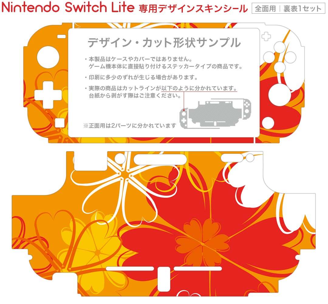 製品名 Nintendo Switch Lite専用 デザインスキンシール セット内容 Nintendo Switch Lite本体用スキンシール(裏表)各1枚 ※液晶側シールは2パーツに分かれていますニンテンドースイッチライト専用です。据え置き機のSwitch本体やJoyコンには対応していません。 商品特徴 3M社製の再剥離性シートを素材に採用し、細かな位置調整がしやすく貼り直しが容易です。また、エアフリーでもありますので気泡が簡単に逃げるので、キレイに貼ることができます。専用の業務プリンターを使い、商品画像と遜色のない美しい印刷仕上がり。 注意事項 画像はサンプルですので、ご覧の環境によっては多少色味に違いを感じる場合がございます。 イメージと違った、モニターと色味が異なるという理由での交換や返金はご対応出来かねます。スキンシールのみの販売で、ニンテンドースイッチ本体などは付属しません。シワができた場合、ドライヤーなどで軽く温め、外側に向けてシワを伸ばすように貼ってください。初回貼付時の位置調整や貼り直しは可能ですが、しっかりと押し付けて接着させた後の再剥離、再利用は保証しておりません。また接着部に油分や汚れが付着しますと角の部分は剥がれやすくなりますので、貼付時はあまり触れないようにご注意ください。無地のセミグロスシートにデザインをプリントした商品で、デコなどの加工はございません。 凹凸や光沢があるように見えたり布地や金属を素材にしたように見える商品もありますが、デザインの図版によるものです。印刷時に微妙な画像のズレが生じる場合がございます。ご注文後に1点1点制作する受注生産品の為、不良品以外のご返品や交換は固くお断りします。 商品発送 完全受注生産のハンドメイド商品となりますので、既製品と比べて発送までお時間を頂いています。 基本的に決済確認後2?3営業日、最大で10営業日での発送となります。繁忙期や休業日明けの場合はさらに時間がかかる場合があります。 その際には別途メールにてご連絡致します。メール便の場合、発送日から到着までに2?4日ほどかかる場合が多く、紛失などの保障もご対応できかねます。あらかじめご了承下さい。