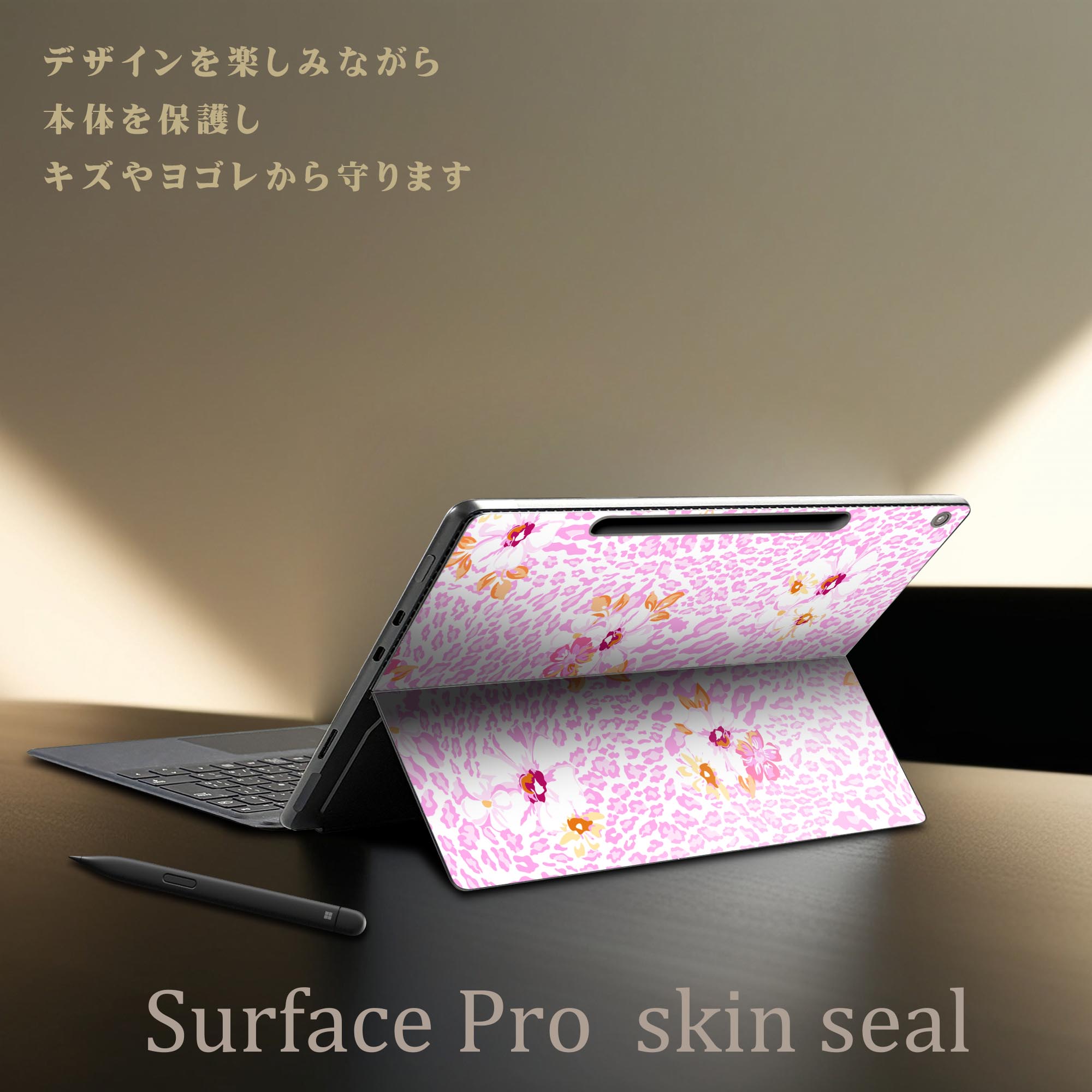Surface Pro 12 インチ (2025) 用 スキンシール 全面スキンシール フル SurfacePro12 用 背面 底 ステッカー 保護シール 高品質再剥離性シート キャラクター かわいい 023396 女性 顔 人物 005246 ハイビスカス ピンク ヒョウ柄