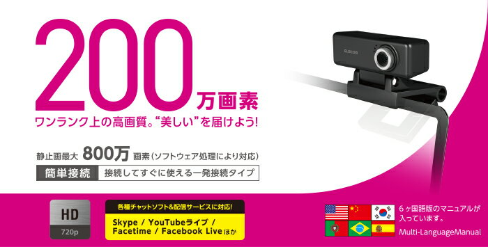 【商品説明】■1600×1200ピクセルの高解像度に対応し、すみずみまで美しく、きれいな映像が楽しめる高画質200万画素Webカメラです。■パソコンに接続するだけですぐに使える一発接続タイプです。■SkypeやSkype for Businessなどの各種チャットソフトや、YouTubeライブやFacebook Live、ニコニコ生放送やTwitchなどのライブ配信サービスで動作確認済みです。■※YouTubeライブやTwitchでは別途ライブエンコーダーを使用する必要があります。■高精細ガラスレンズを搭載し、鮮明な動画や静止画を楽しめます。■動画は記録画素数 最大1600×1200ピクセルに対応しています。■動画だけでなく、800万画素の静止画を撮影して送信することも可能です。■カメラ本体に内蔵マイクを搭載しているので、複数人で会話をすることも可能です。■ノートパソコンやデスクトップパソコンのディスプレイに取り付け可能で、平面にも設置可能なマルチスタンドを採用しています。■カメラ本体は上下に角度を調整可能です。■無料ダウンロードできる「WebCamアシスタント」をインストールすることで、YouTube投稿機能、動画の簡易編集機能などの便利な機能を使用可能です。※Macintoshには対応していません。■多国語マニュアル(英語、中国語[繁体・簡体]、韓国語、スペイン語、ポルトガル語)が付属しています。【仕様】■対応機種:USB2.0インターフェイスを搭載したWindowsパソコン、Macintosh■対応OS:Windows 10、Windows 8.1、Windows7、Windows XP、macOS 10.12 Sierra 以降■対応OSの備考:※各OSの最新バージョンへのアップデートや、サービスパックのインストールが必要になる場合があります。※Windows XPにおけるオンラインサービスの使用はサポート対象外です。■動作環境:CPU:インテル(R) Core(TM) i3 1.2GHzと同等以上、メインメモリ:1GB以上、HDD空き容量:1GB以上※上記に加え、同時に使用する各種ソフトウェアの必要環境を満たす必要があります。■受像素子:1/5型 CMOSセンサー■有効画素数:約200万画素■色数:約1677万色(24bit)■静止画 記録画素数:最大約800万画素(ソフトウェア処理により対応)■動画 記録画素数:最大1600×1200ピクセル■最大フレームレート:30FPS(〜1280×720ピクセル)、6FPS(〜1600×1200ピクセル)■撮影画角:対角68度■レンズF値:F2.8■フォーカス方式:固定フォーカス■撮影距離:30cm〜無限遠(レンズ先端より)■スタンド角度調整:上下方向■カメラ本体 インターフェイス:USB2.0(タイプAオス)■カメラ本体 ケーブル長:約1.5m■内蔵マイク 方式:エレクトレットコンデンサー方式(モノラル)■内蔵マイク 指向性:無指向性■カメラ本体 カラー:ブラック■カメラ本体 外形寸法:約 幅60.0mm×奥行52.3mm×高さ39.0mm※ケーブルを含まず■カメラ本体 質量:約 66g※ケーブルを含む■動作時環境条件:温度:5℃〜40℃、湿度:〜90%RH(ただし結露なきこと)■保存時環境条件:温度:-10℃〜60℃、湿度:〜90%RH(ただし結露なきこと)■保証期間:6ヶ月■付属品:ユーザーズマニュアル、多言語マニュアル【発送予定について】表記の発送予定はあくまで目安です。メーカーの在庫状況によっては、さらにお時間をいただく場合がございます。