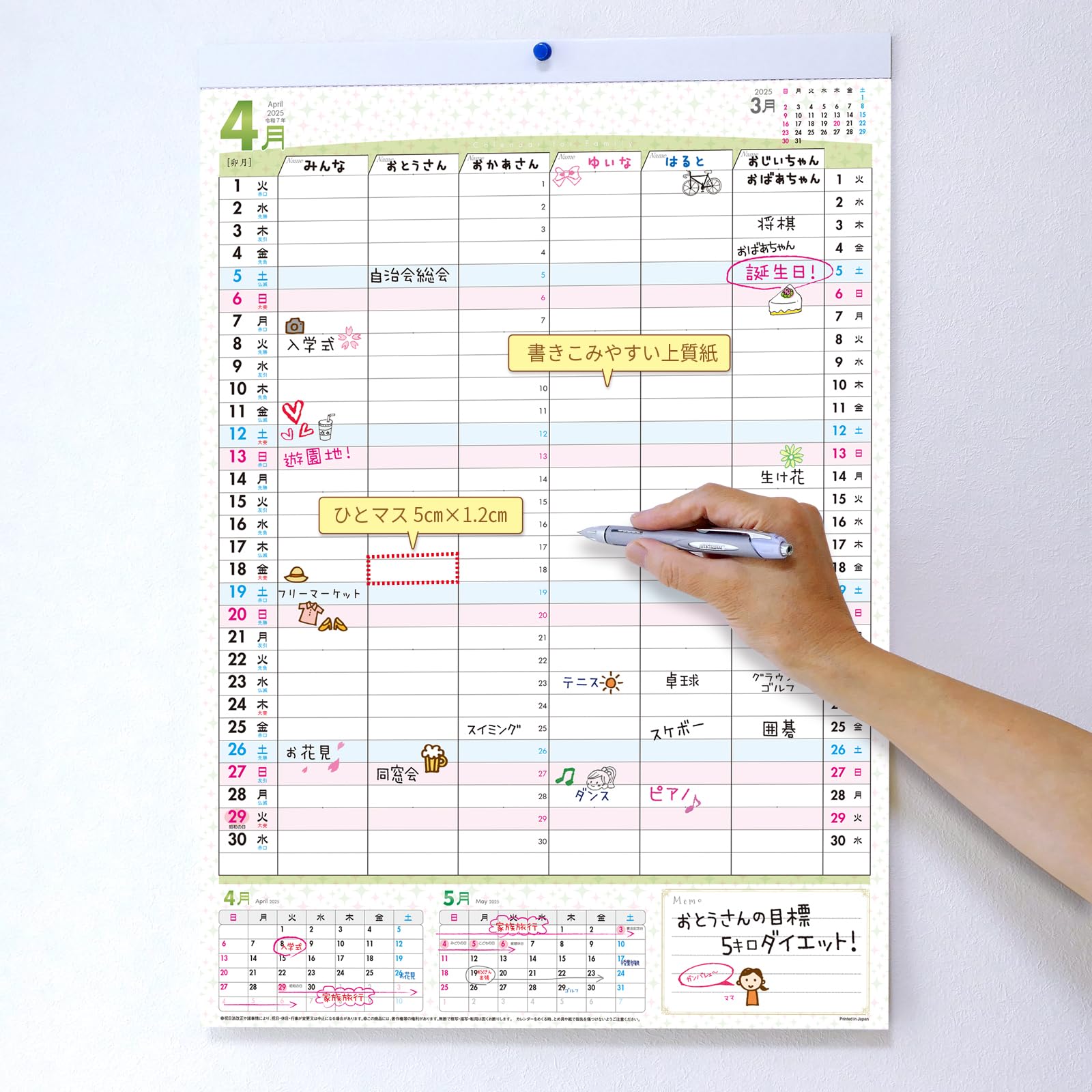 商品情報商品の説明●サイズ/約38×54cm ●用 紙/上質90kg ※ご注意/祝日法改正や諸事情により、祝日・休日・行事が変更又は中止になる場合があります。 ※この商品には、著作権等の権利があります。無断で複写・描写・転用は固くお断りします。 ※仕様、デザインは予告なく変更する場合があります。 ※ 商品の色・素材の感じ等は、ご使用のモニターによって実際の商品と異なる場合がございます。予めご了承ください。主な仕様 【新学期・新生活にぴったり!】 2025年4月始まり「家族カレンダー」で、新年度をスマートにスタート! 来年3月までたっぷり使えるので1年間の予定管理がぐっとラクに!【家族の予定がひと目でわかる!】 6人分まで書き込めるスペースで、家族の予定管理がスムーズに。【書き心地にこだわった上質紙】 ペンがスッと走る、ほどよい厚みの用紙。にじみにくく、きれいに書けます。【家庭でもオフィスでも大活躍】 家族の予定だけでなく、社員やスタッフのシフト管理にも使える万能カレンダー。【便利な工夫がいっぱい】 ・切り取りやすいミシン目付き ・壁掛けピン止め穴つき ・上部に前月、下部に当月・翌月表示 → 長期の予定も立てやすい!