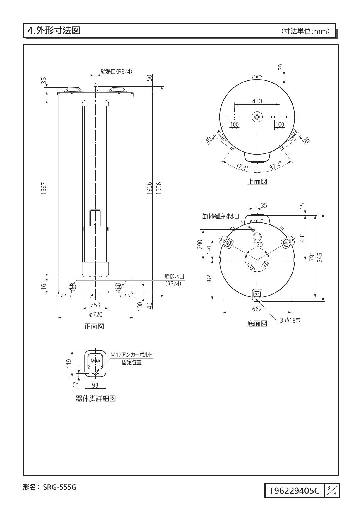 【SRG-555G】 三菱 電気温水器 標準圧力型 80kPa 丸型 550L 屋外設置 【大型商品・メーカー直送】三菱エコキュート別売部品GZ-B1F、GZ-B2F、GT-30F、LM-620B、LM-650B電気温水器[別売]給湯専用タイプ用GT-20H、BA-T12G、GT-54G、GT-55G、GT-57G、GT-60G、GT-61G、GT-70G、GT-T19G、GT-T40G、GT-T8G、GZ-7D、GZ-A1C、GZ-A2C、GZ-T1C、GZ-T2C、RMC-9※お届け日につきましてはメールご連絡にて調整させていただきますご不在時の商品配達のご連絡のため、電話番号はなるべく携帯電話の番号を入力してください。仕様表50Hz/60Hzタンク容量(L)550外形寸法(高さ×幅×奥行)(mm)1996×720×791消費電力(kW)最大6.41電圧(V)200V電源(φ)単相沸き上げヒーター容量(kW)6.4本体質量(kg)62満水時質量(kg)612図面