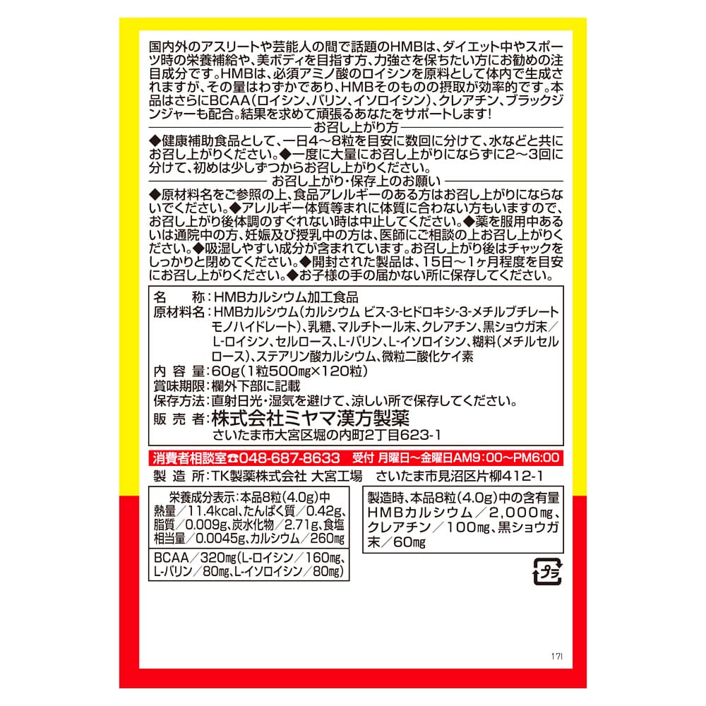 HMB+BCAA ブラックジンジャー 商品特長 ・国内外のアスリートや芸能人の間でも話題の成分をギュッと凝縮 ・HMBが筋タンパク質の合成を促進 ・筋肉のエネルギー源となるBCAA、瞬発力をサポートするクレアチンも配合 ・ブラックジンジャー配合でボディメイクをサポート 剤形 錠剤 内容量 500mg/粒×120粒 1日目安量 4~8粒(15~30日分) 原材料名・成分含有量 【原材料】 HMBカルシウム、乳糖、マルチトール末、クレアチン、黒ショウガ末、L-ロイシン、セルロース、L-バリン、L-イソロイシン、糊料(メチルセルロース)、ステアリン酸カルシウム、微粒二酸化ケイ素 【栄養成分表示】:本品8粒(4.0g)中 熱量:11.4kcal たんぱく質:0.42g 脂質:0.009g 炭水化物:2.71g 食塩相当量:0.0045g カルシウム:260mg BCAA:320mg (L-ロイシン:160mg、L-バリン:80mg、L-イソロイシン:80mg) (一日目安量8粒中) HMBカルシウム/2,000mg BCAA/320mg (L-ロイシン/160mg、L-バリン/80mg、L-イソロイシン/80mg) クレアチン/100mg 黒ショウガ末/60mg 賞味期限 枠外下部に記載 保存方法 直射日光・湿気を避けて、涼しいところで保存してください。 注意事項 原材料名をご参照の上、食品アレルギーのある方はお召し上がりにならないでください。 開封された商品は1か月程度を目安にお召し上がりください。 お子様の手に届かないところに保存してください。 ▼CBD Innovation 商品ラインナップ▼ 【CBD含有 食品】 CBDオイル 寝る前が効果的!心の健康に 体感 グミ クッキー 大人気! 手軽においしい CBD 体感 グミ クッキー 体感 カプセル CBD その他カンナビノイド ゆっくり長く確実に作用 常備推奨カプセル おすすめCBDサプリメント 【CBD 特売商品】 CBD お買い得商品など お得なCBD商品など色々 【VAPE 吸引】 体感 カンナビノイド リキッド カートリッジ アトマイザー VAPE(ベイプ)交換取付 高濃度 CBD,CBG,CBN,CNP サティバ、インディカ その他最新カンナビノイドリキッド 元気 サティバ系 リキッド カートリッジ サティバ リキッドカートリッジ チル インディカ系 リキッド カートリッジ インディカ リキッドカートリッジ ハイブリッド カンナビノイド リキッド カートリッジ ハイブリッド リキッドカートリッジ VAPE バッテリー 【510】 VAPE バッテリー 【ハーブ】 CBD,CBN,体感 ジョイント ハーブ 厳選した葉(ハーブ)とテルペン、カンナビノイド高含有 【スキンケア】 CBD スキンケア お肌へCBDのご褒美を 【CBD セット商品】 CBD関連 各種セット商品 VAPEセット CBD製品のお得なセット 【サプリメント商品】 美容 ダイエット 減量 サプリメント 減量 ダイエット系 美容 脳機能 サプリメント 【関連キーワード】 HMB BCAA クレアチン ブラックジンジャー クラチャイダム 黒ショウガ末 ダイエット ボディメイク サポート 筋力 筋トレ 美容HMB+BCAA ブラックジンジャー ダイエット ボディメイクサポートサプリ HMB-Ca BCAA クレアチン ブラックジンジャー 筋肉 筋トレ 美容 減量 必須アミノ酸 結果を求めて頑張るあなたに HMB+BCAA ブラックジンジャー HMB+BCAA ブラックジンジャー(120粒) 【特徴】 8粒中 ・プロテイン約13杯分のHMB-Ca 2,000mgを配合 ・ブラックジンジャー(黒ショウガ末)60mg ・クレアチン100mg配合 ボディメイクを強力にサポート ・筋力パフォーマンスやスタミナをトータルサポート