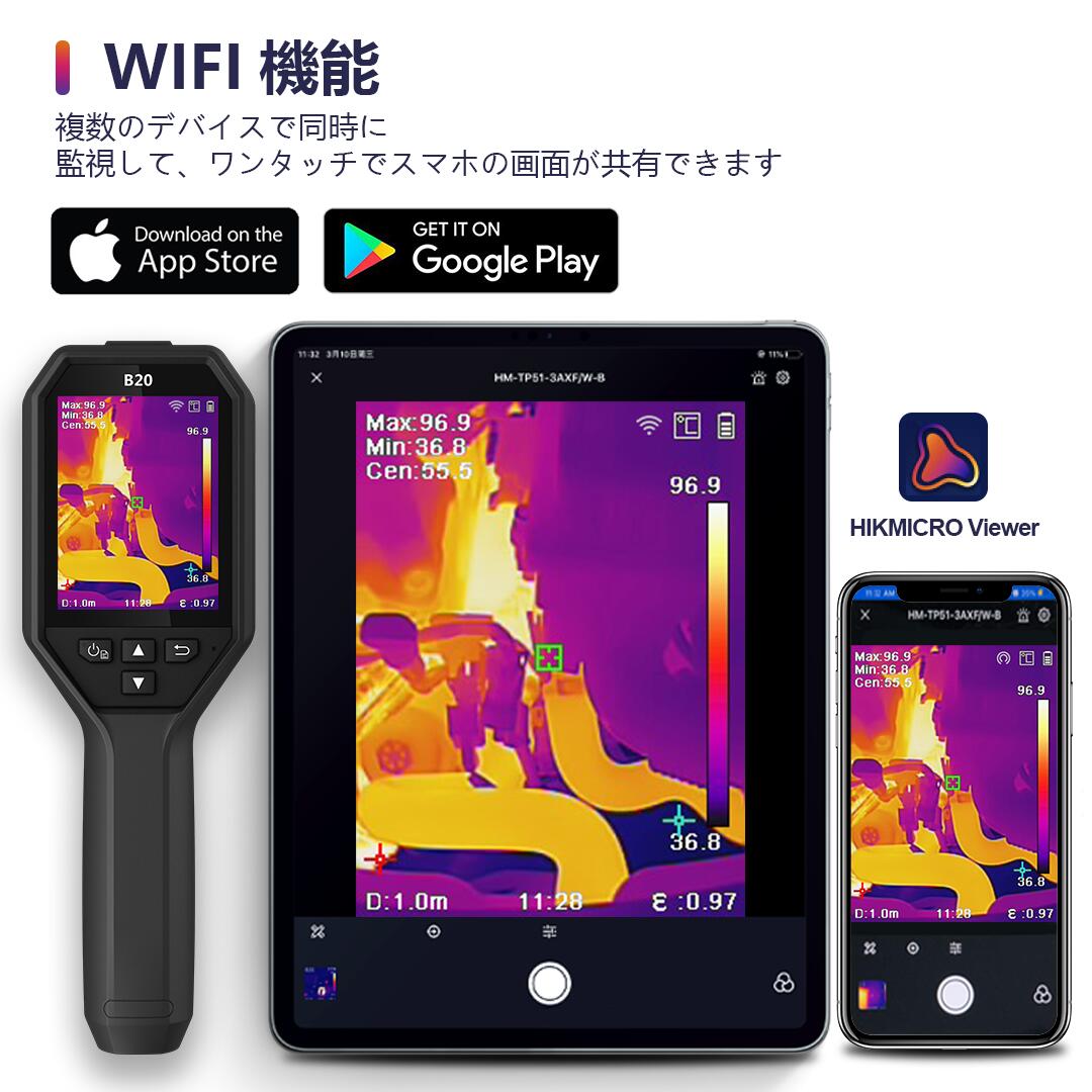 赤外線サーモグラフィ B20 HIKMICRO社 熱画像 256 x 192 (49152画素) フレームレート : 25Hz WiFi ライブ画像転送 -20 °C~550 °C計測 測定波長: 8-14 μm 3.2インチ ハイクマイクロ社 赤外線サーモグラフィー サーモカメラ 熱画像