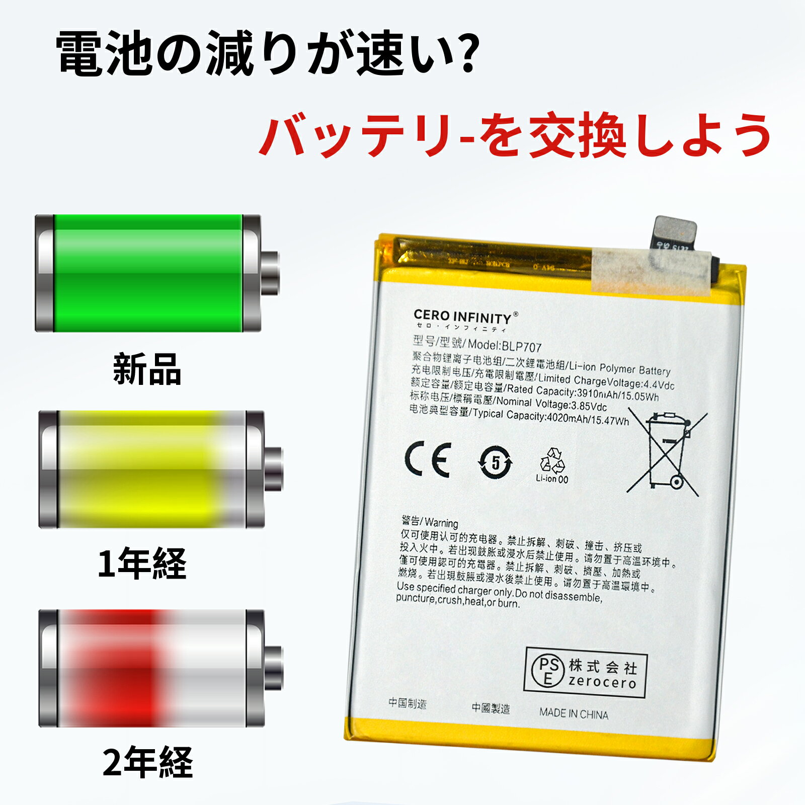 ブランド OPPO 電圧 3.85V 容量 3910mAh 純正品型番 対応機種 F11pro A9X A9 PCAM10 F11 A9X BLP707 F11 BLP707 メーカー型番 INMPOPPBLP707WH-AAG-YDWRZE F11 BLP707 この商品は互換用バッテリーです ■重要注意事項■ 1. 製品仕様は改良のため予告なく変更する場合がございます 2. 実際の駆動時間は使用条件により異なります 3. 正規品とは外装デザインが異なる場合があります 注文前の重要確認事項 ▲個人輸入商品の利用制限 ■注文者本人による「使用/消費」のみ許可 ■第三者への譲渡?転売は電気用品安全法第29条違反 商品仕様について ◆同一性能商品の価格差はメーカー部品調達先の違いによるもので、品質?機能に差異は一切ありません 品質保証基準 ◆PSE認証について ■生産時期,モデル更新に伴い申請業者が変更される場合あり ■全て「電気用品安全法」適合品(認証番号要確認可)■製品の製造時期および世代更新に伴いまして、PSE認証の申請業者に変更が生じております。ただし製品品質に影響はございませんので、何卒ご安心くださいませ。■PSEマークの種類:PSE■届け出事業者名:株式会社zerocero
