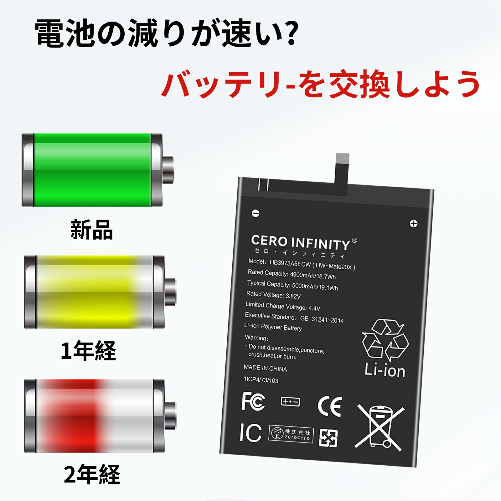 ブランド HUAWEI 電圧 3.82V 容量 4900mAh 純正品型番 対応機種 4 3973A5ECW MATE20X EVR-AL00 L29 10 8X Max Play 30PLUS X30MAX メーカー型番 INMPHUAMAT20XBK-AAC-YGBIRZE EVR-AL00 この商品は互換用バッテリーです ■重要注意事項■ 1. 製品仕様は改良のため予告なく変更する場合がございます 2. 実際の駆動時間は使用条件により異なります 3. 正規品とは外装デザインが異なる場合があります 注文前の重要確認事項 ▲個人輸入商品の利用制限 ■注文者本人による「使用/消費」のみ許可 ■第三者への譲渡・転売は電気用品安全法第29条違反 商品仕様について ◆同一性能商品の価格差はメーカー部品調達先の違いによるもので、品質・機能に差異は一切ありません 品質保証基準 ◆PSE認証について ■生産時期,モデル更新に伴い申請業者が変更される場合あり ■全て「電気用品安全法」適合品(認証番号要確認可) ?PSEマークの種類:PSE ?届け出事業者名:株式会社zerocero