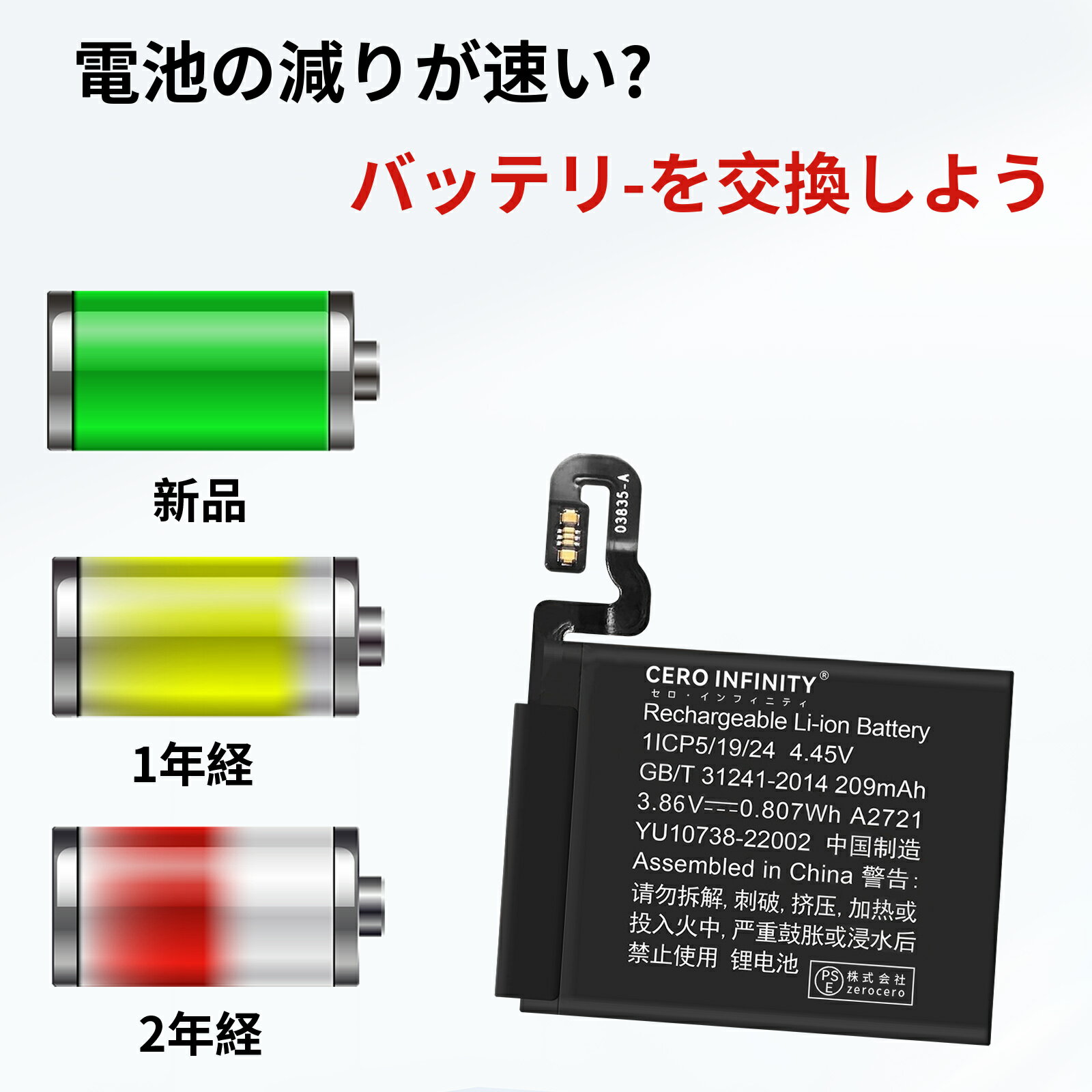 ブランド Apple 電圧 3.86V 容量 209mAh 純正品型番 対応機種 4 Watch SE2 GPS 40mm A2721 メーカー型番 INMPAPPA2721BKY-2D-AAB-YJMRZE Watch SE2 GPS 40mm この商品は互換用バッテリーです ■重要注意事項■ 1. 製品仕様は改良のため予告なく変更する場合がございます 2. 実際の駆動時間は使用条件により異なります 3. 正規品とは外装デザインが異なる場合があります 注文前の重要確認事項 ▲個人輸入商品の利用制限 ■注文者本人による「使用/消費」のみ許可 ■第三者への譲渡・転売は電気用品安全法第29条違反 商品仕様について ◆同一性能商品の価格差はメーカー部品調達先の違いによるもので、品質・機能に差異は一切ありません 品質保証基準 ◆PSE認証について ■生産時期,モデル更新に伴い申請業者が変更される場合あり ■全て「電気用品安全法」適合品(認証番号要確認可) ?PSEマークの種類:PSE ?届け出事業者名:株式会社zerocero