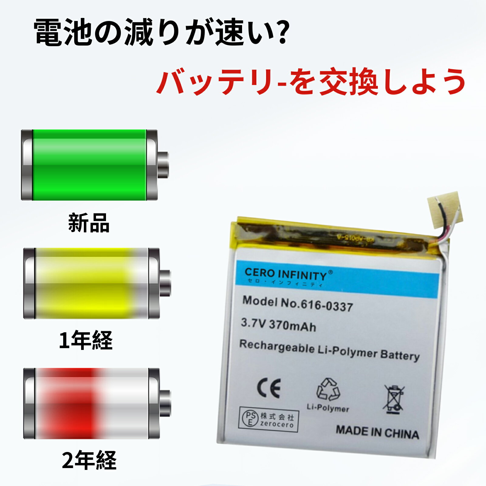 ブランド iPod 電圧 3.7V 容量 370mAh 純正品型番 対応機種 4 iPod Nano 3rd NANO3 616-0337 メーカー型番 INMPIPD616033WH-AAA-YKZRZE iPod Nano 3rd この商品は互換用バッテリーです ■重要注意事項■ 1. 製品仕様は改良のため予告なく変更する場合がございます 2. 実際の駆動時間は使用条件により異なります 3. 正規品とは外装デザインが異なる場合があります 注文前の重要確認事項 ▲個人輸入商品の利用制限 ■注文者本人による「使用/消費」のみ許可 ■第三者への譲渡・転売は電気用品安全法第29条違反 商品仕様について ◆同一性能商品の価格差はメーカー部品調達先の違いによるもので、品質・機能に差異は一切ありません 品質保証基準 ◆PSE認証について ■生産時期,モデル更新に伴い申請業者が変更される場合あり ■全て「電気用品安全法」適合品(認証番号要確認可) ?PSEマークの種類:PSE ?届け出事業者名:株式会社zerocero