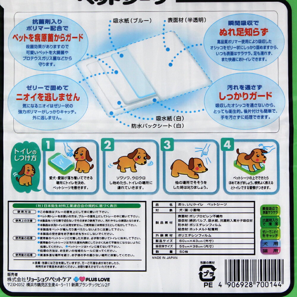 メーカー:プラスラブ吸収力に優れたコンパクトタイプ!プラスラブ おっ、いいトイレ ペットシーツ ワイド 50枚対象犬、猫、小動物特長●ペット用ワイドサイズのトイレシーツです。●瞬間吸収で足も濡れず、快適におトイレできます。●抗菌剤入ポリマー配合で、ペットを病原菌からガードします。●気になるニオイはゼリー状の強力ポリマーがしっかりキャッチして外に逃しません。●汚れを通さずしっかりガードするため、後片付けも簡単で、手を汚さずに処理できます。数量50枚サイズ全体:60×43cm吸収体サイズ:55×38cm原材料表面材:ポリプロピレン不織布吸収材:綿状パルプ、吸水紙、抗菌剤入高分子吸収材防水材:ポリエチレンフィルム結合剤:ホットメルト粘着剤原産国日本ご注意※本品は犬・猫・小動物用ペットシーツです。目的以外の用途には使用しないでください。※ブルーの面を上にしてトレーや床に敷いてください。※汚れやモレの原因になるのでハサミ等で切らないでください。※本品はトイレには流せません。ご使用後には焼却ゴミとして処分してください。パッドロッカー Pad Locker 本体 1個+専用カートリッジ 取替え用 1個トイレに流せるティッシュ ドライタイプ 250枚×3個パックポリ手袋 外エンボス加工 M−1 100枚入り … _dog _animal _neko プラスラブ おっ いいトイレ ペットシーツ ワイド 50枚 4906928700144 犬 犬用品 猫 猫用品 小動物 シーツ トイレシート 吸収 トイレ ワイドサイズ 20190422 tsbs opa2_choku ペットシート y19m04 トイレシーツプラスラブ おっ、いいトイレ ペットシーツ ワイド 50枚×4袋■この商品をお買い上げのお客様は、下記商品もお買い上げです。※この商品には付属しません。■パッドロッカー Pad Locker 本体 1個+専用カートリッジ 取替え用 1個トイレに流せるティッシュ ドライタイプ 250枚×3個パックポリ手袋 外エンボス加工 M−1 100枚入り